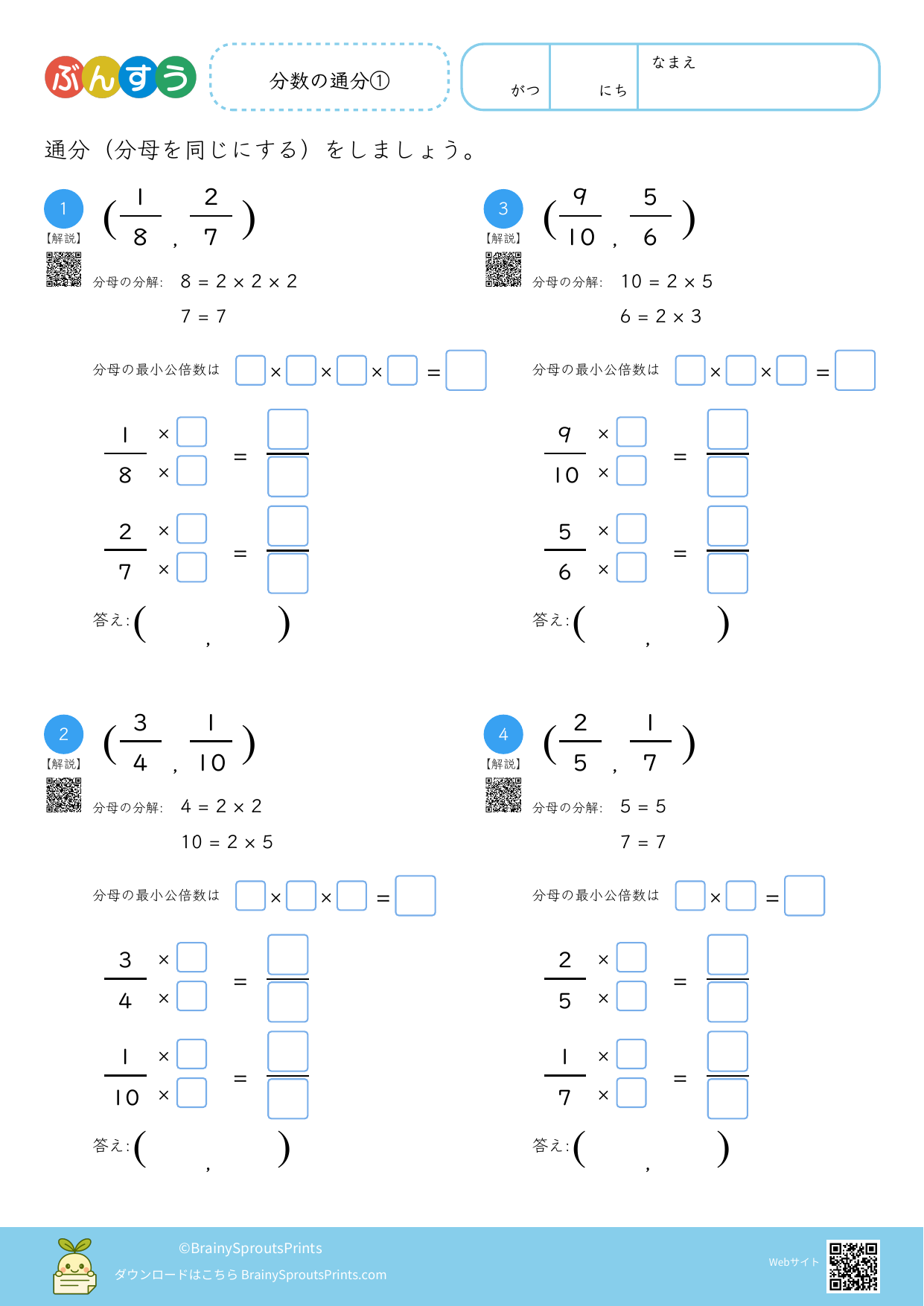 分けた大きさや数の関係を見ながら、分数の意味を整理しやすいプリントです。計算だけでなく、何を1と見るのか、どこを比べているのかを意識すると理解が深まりやすくなります。 図と式を行き来しながら使うと、分数が記号だけの学習になりにくくなります。