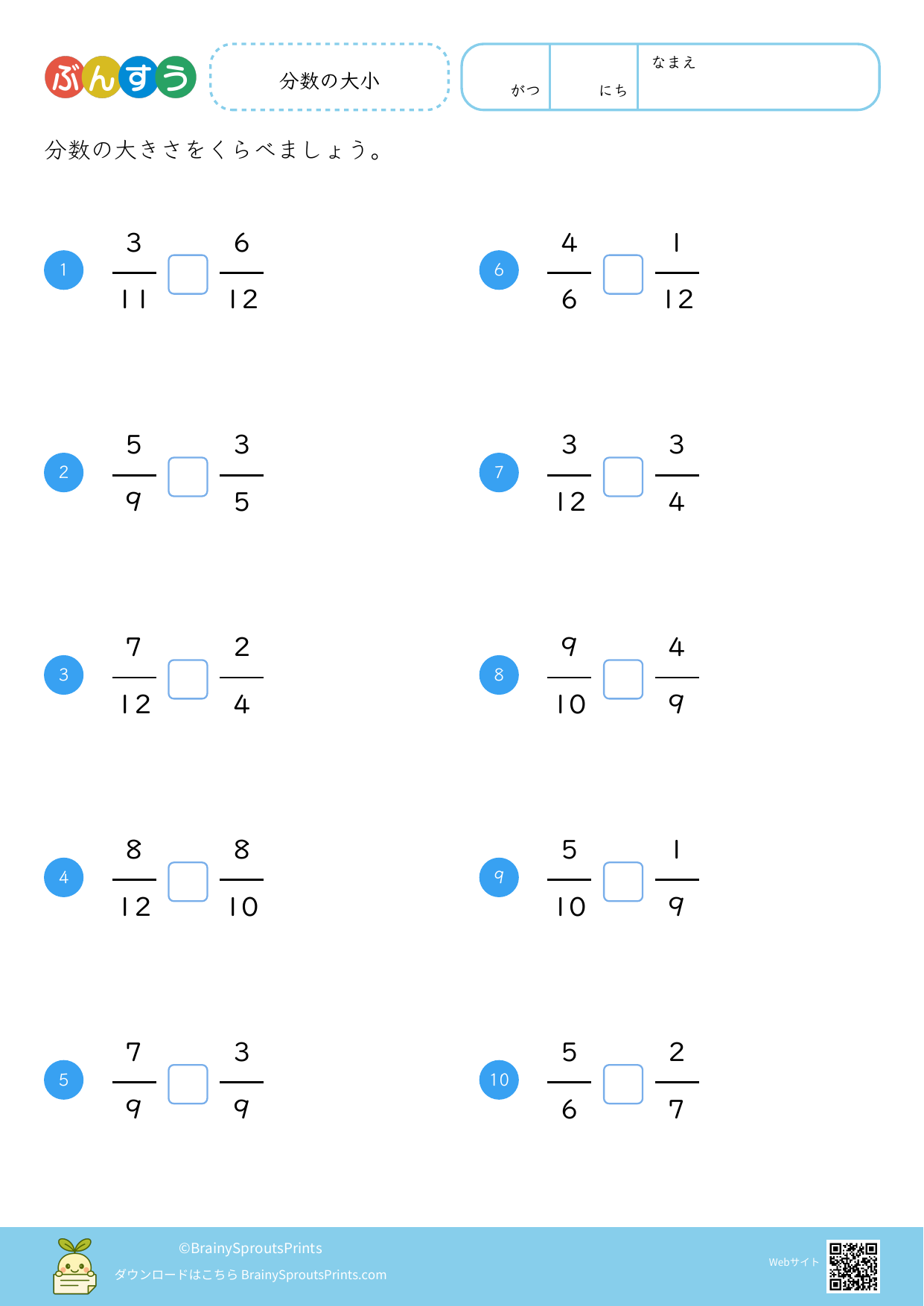 分けた大きさや数の関係を見ながら、分数の意味を整理しやすいプリントです。計算だけでなく、何を1と見るのか、どこを比べているのかを意識すると理解が深まりやすくなります。 図と式を行き来しながら使うと、分数が記号だけの学習になりにくくなります。