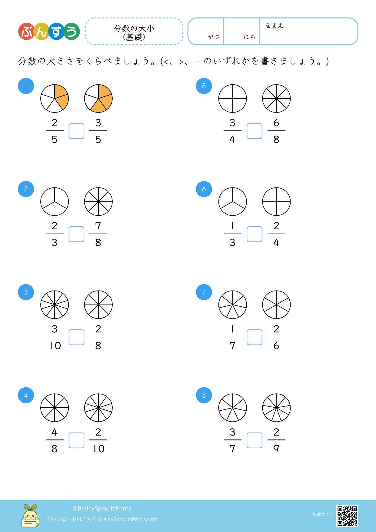分けた大きさや数の関係を見ながら、分数の意味を整理しやすいプリントです。計算だけでなく、何を1と見るのか、どこを比べているのかを意識すると理解が深まりやすくなります。 図と式を行き来しながら使うと、分数が記号だけの学習になりにくくなります。