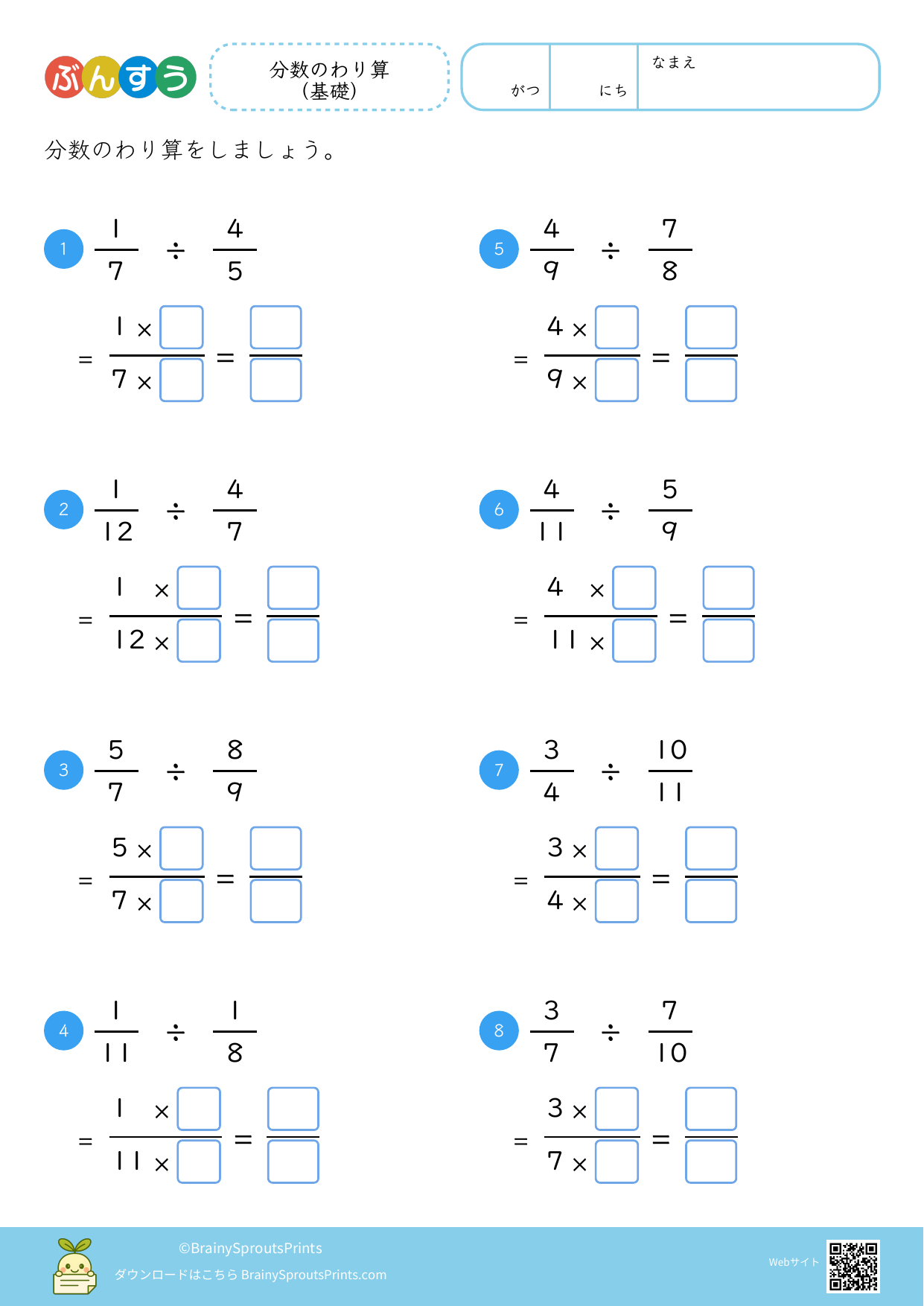 分けた大きさや数の関係を見ながら、分数の意味を整理しやすいプリントです。計算だけでなく、何を1と見るのか、どこを比べているのかを意識すると理解が深まりやすくなります。 図と式を行き来しながら使うと、分数が記号だけの学習になりにくくなります。