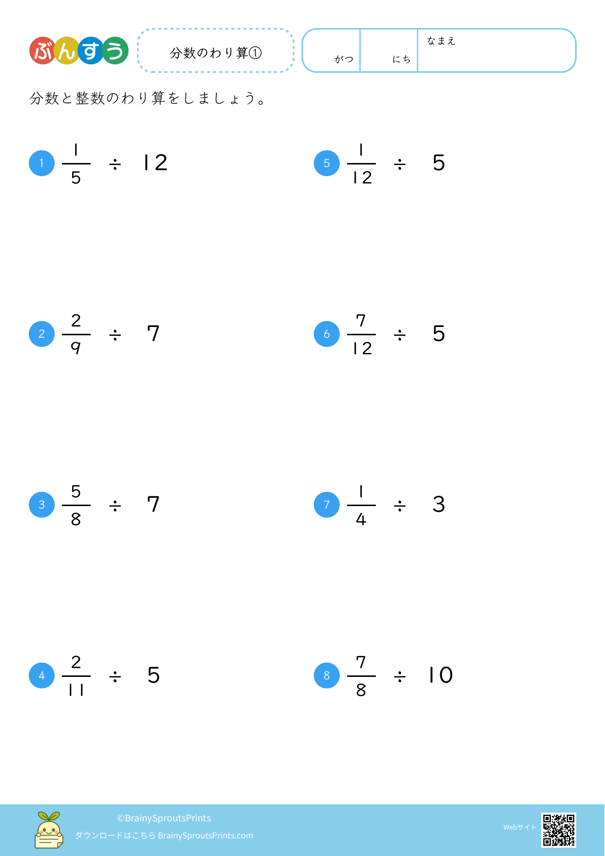 分けた大きさや数の関係を見ながら、分数の意味を整理しやすいプリントです。計算だけでなく、何を1と見るのか、どこを比べているのかを意識すると理解が深まりやすくなります。 図と式を行き来しながら使うと、分数が記号だけの学習になりにくくなります。
