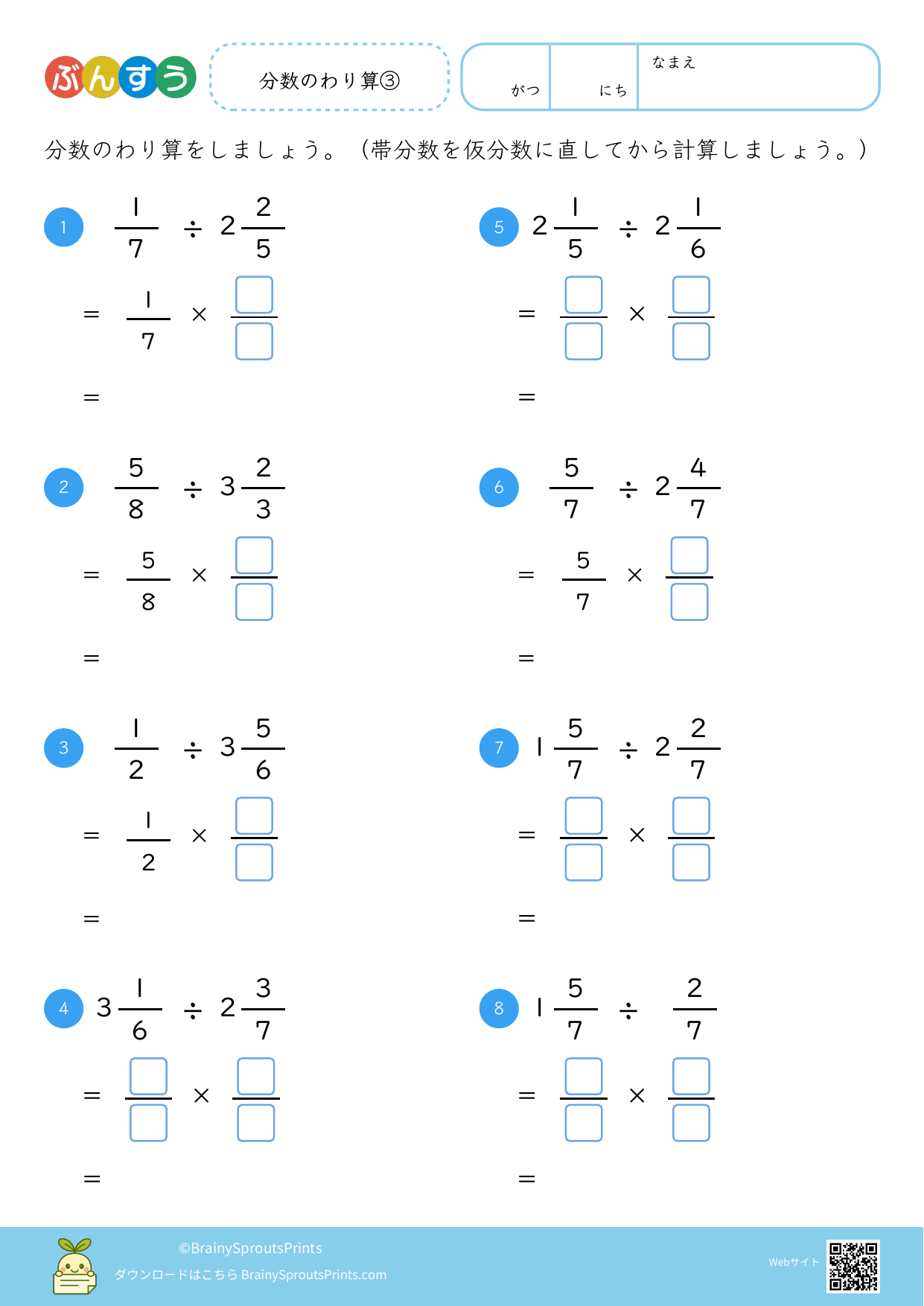 分けた大きさや数の関係を見ながら、分数の意味を整理しやすいプリントです。計算だけでなく、何を1と見るのか、どこを比べているのかを意識すると理解が深まりやすくなります。 図と式を行き来しながら使うと、分数が記号だけの学習になりにくくなります。