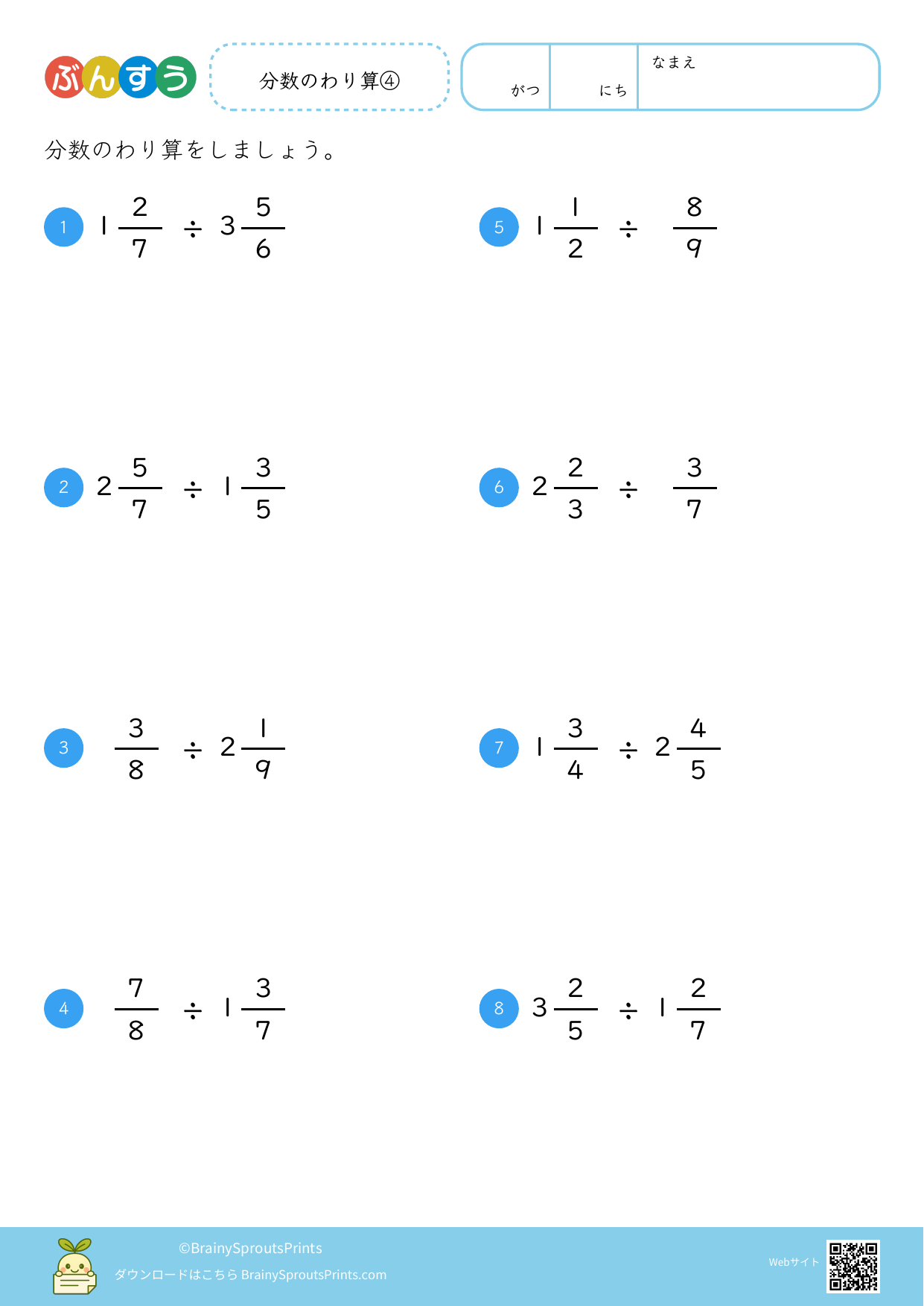 分けた大きさや数の関係を見ながら、分数の意味を整理しやすいプリントです。計算だけでなく、何を1と見るのか、どこを比べているのかを意識すると理解が深まりやすくなります。 図と式を行き来しながら使うと、分数が記号だけの学習になりにくくなります。