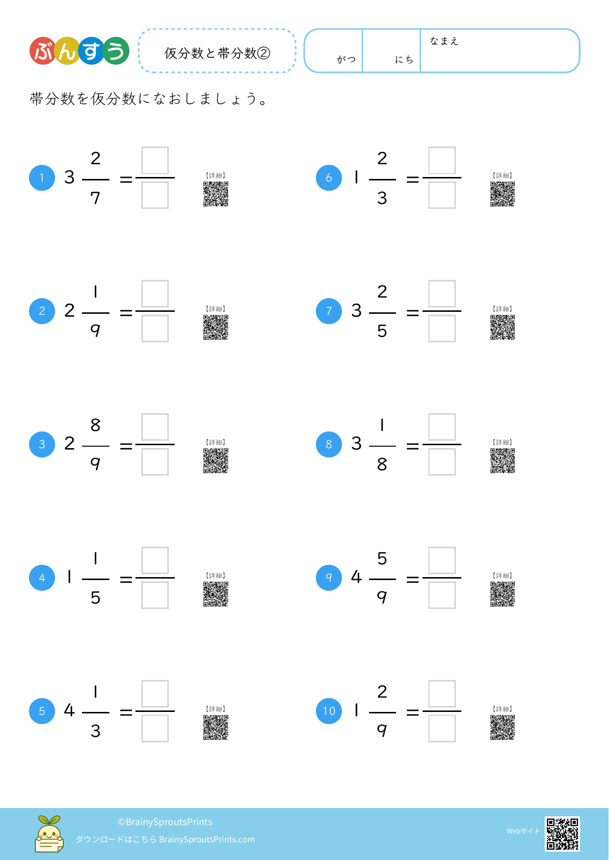 分けた大きさや数の関係を見ながら、分数の意味を整理しやすいプリントです。計算だけでなく、何を1と見るのか、どこを比べているのかを意識すると理解が深まりやすくなります。 図と式を行き来しながら使うと、分数が記号だけの学習になりにくくなります。