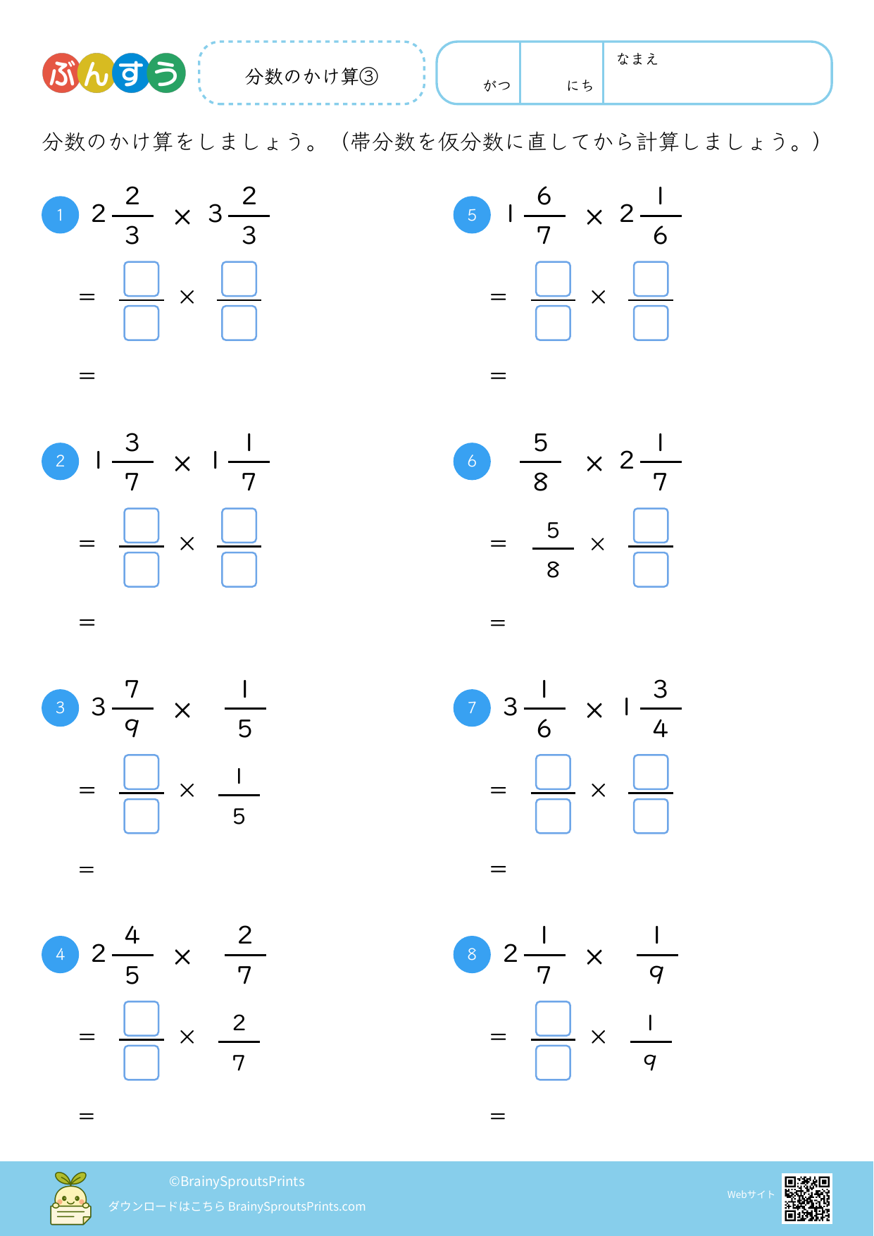 分けた大きさや数の関係を見ながら、分数の意味を整理しやすいプリントです。計算だけでなく、何を1と見るのか、どこを比べているのかを意識すると理解が深まりやすくなります。 図と式を行き来しながら使うと、分数が記号だけの学習になりにくくなります。