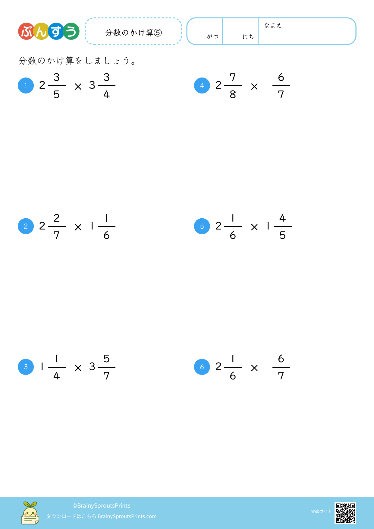 分けた大きさや数の関係を見ながら、分数の意味を整理しやすいプリントです。計算だけでなく、何を1と見るのか、どこを比べているのかを意識すると理解が深まりやすくなります。 図と式を行き来しながら使うと、分数が記号だけの学習になりにくくなります。