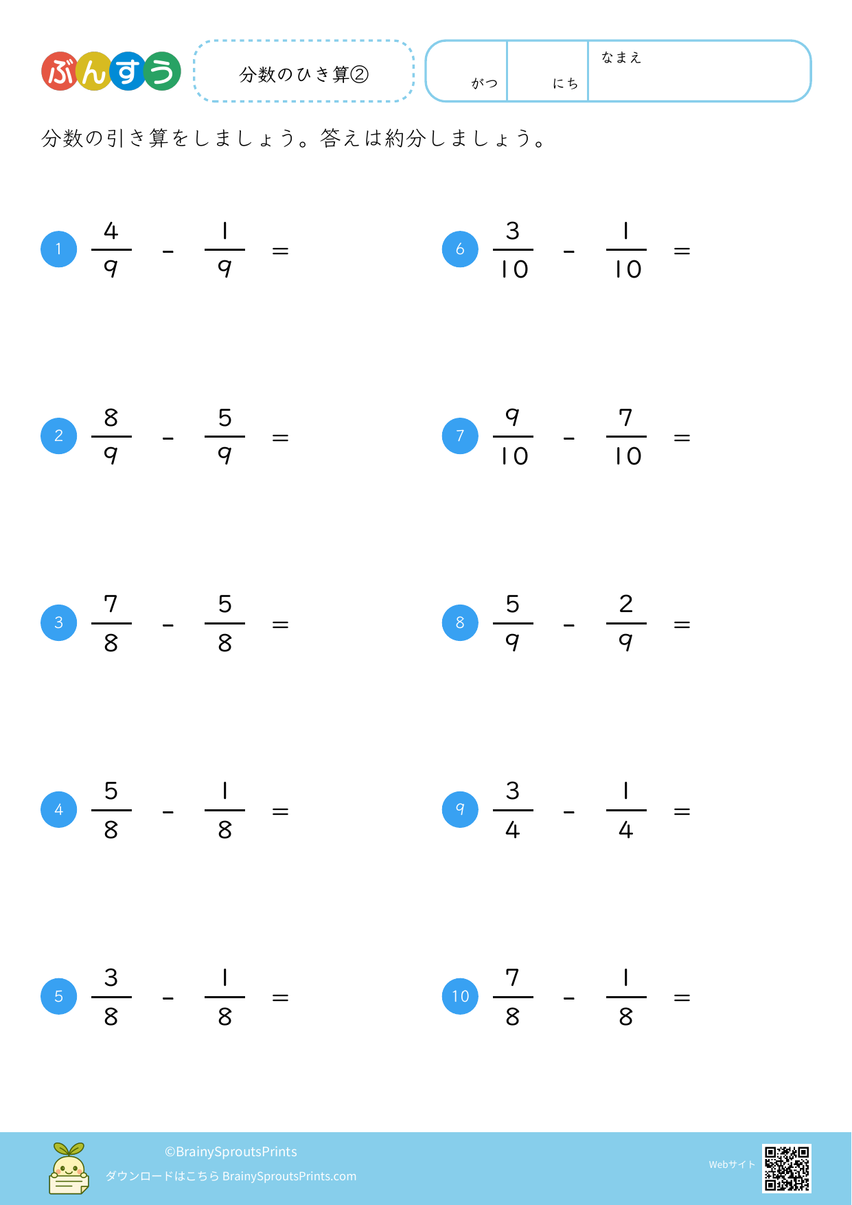 分けた大きさや数の関係を見ながら、分数の意味を整理しやすいプリントです。計算だけでなく、何を1と見るのか、どこを比べているのかを意識すると理解が深まりやすくなります。 図と式を行き来しながら使うと、分数が記号だけの学習になりにくくなります。