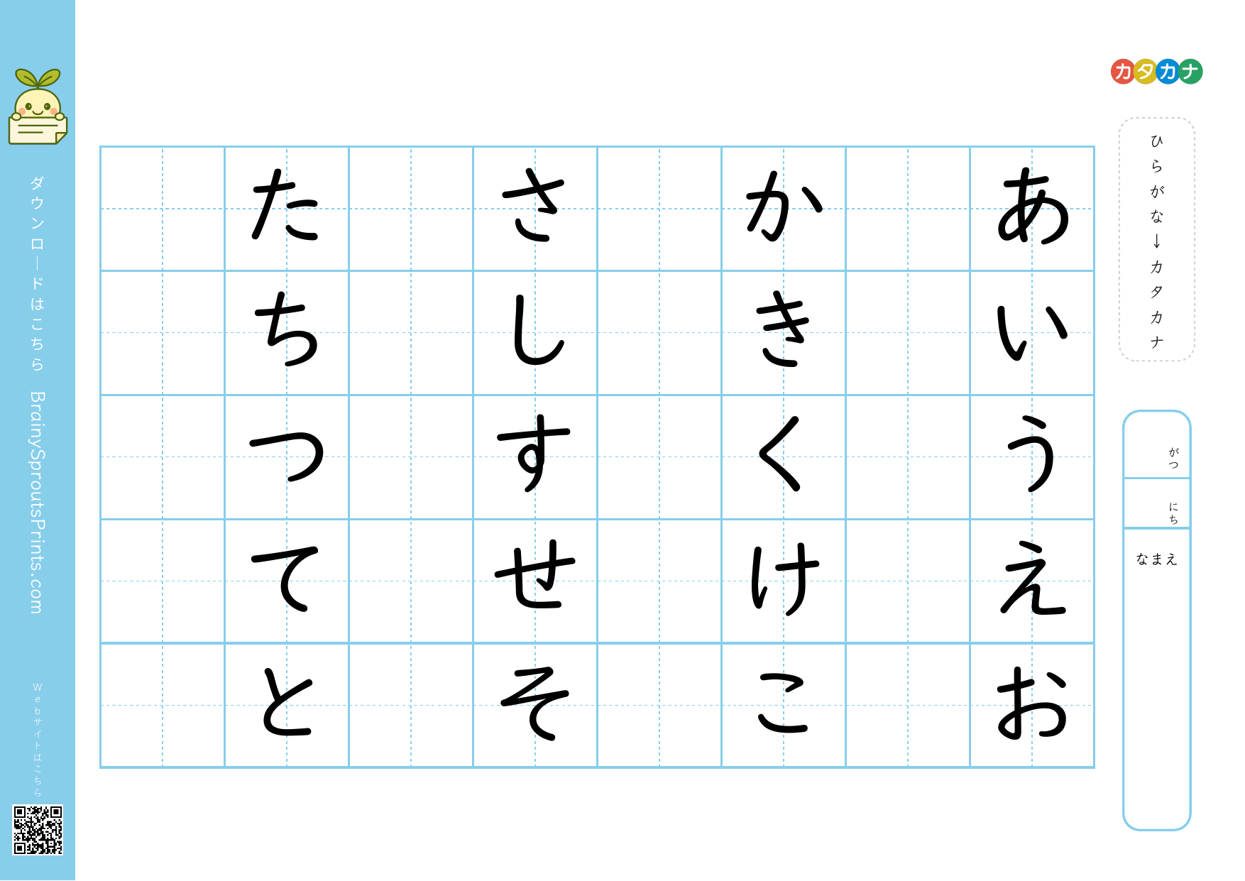 一文字ずつカタカナの形に慣れながら、読み書きの基礎を作りやすいプリントです。ひらがなより形が似て見えやすい文字もあるので、見分けの確認にも向いています。