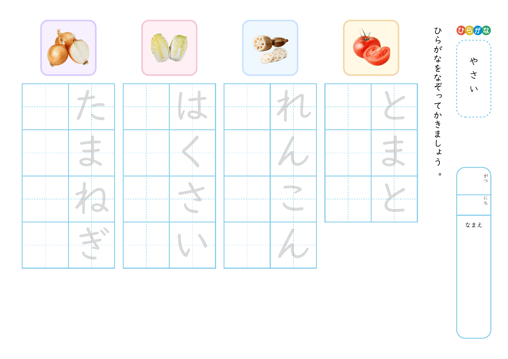 取り組んだあとは、「どの文字が言いやすかった?」「どこが少し難しかった?」と短く振り返ると、次に見直したいポイントが見えやすくなります。 プリントだけで終わらせず、絵本や看板、身の回りの言葉の中で同じ文字を探してみると、学んだことが生活の中につながりやすくなります。
