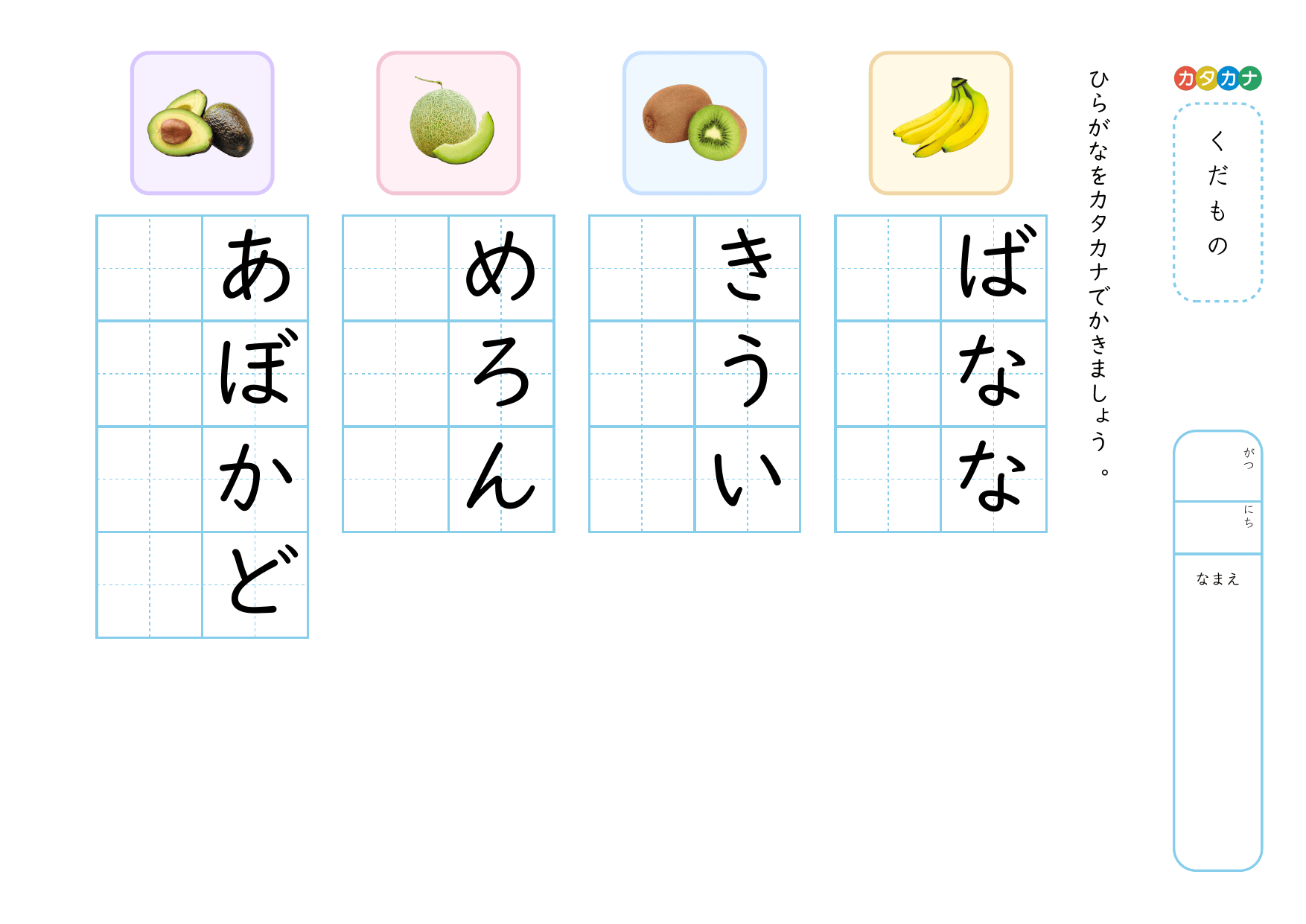 カタカナをことばとして読んだり書いたりしながら、実際に使う形で定着させやすいプリントです。身近な外来語と結びつけると覚えやすくなります。
