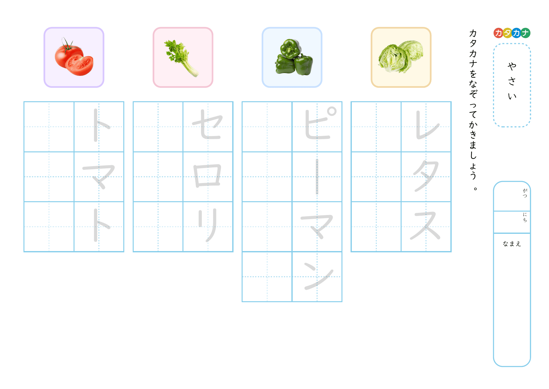 カタカナをことばとして読んだり書いたりしながら、実際に使う形で定着させやすいプリントです。身近な外来語と結びつけると覚えやすくなります。