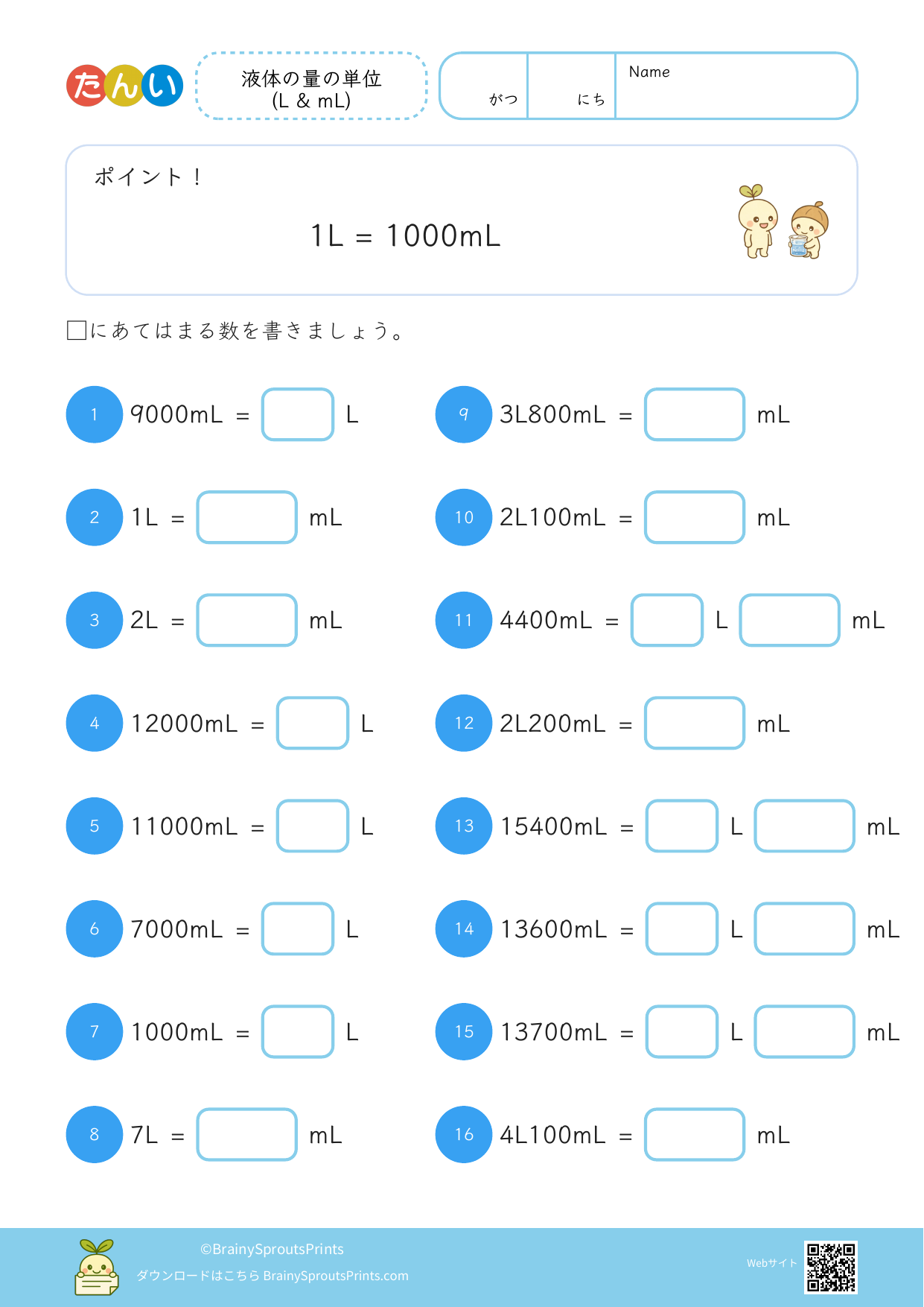 長さ、重さ、かさなどの単位の関係を整理しやすいプリントです。数字の計算だけでなく、どの単位で考えるとわかりやすいかを見ながら進めると、生活の中でも使いやすくなります。