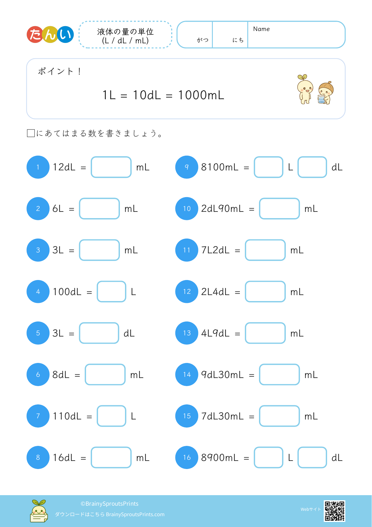 長さ、重さ、かさなどの単位の関係を整理しやすいプリントです。数字の計算だけでなく、どの単位で考えるとわかりやすいかを見ながら進めると、生活の中でも使いやすくなります。