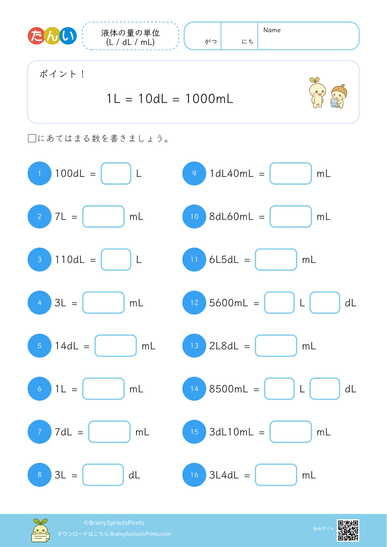 長さ、重さ、かさなどの単位の関係を整理しやすいプリントです。数字の計算だけでなく、どの単位で考えるとわかりやすいかを見ながら進めると、生活の中でも使いやすくなります。