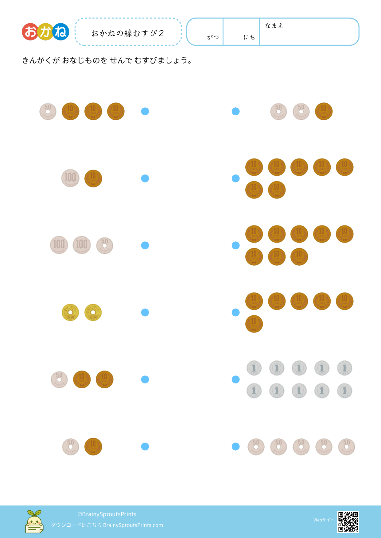 硬貨の種類や金額のまとまりを見ながら、お金の感覚を育てやすいプリントです。計算だけでなく、どの組み合わせで同じ金額になるかを考える力も見やすくなります。 生活に近い内容なので、実物と結びつけながら使うと理解が残りやすくなります。