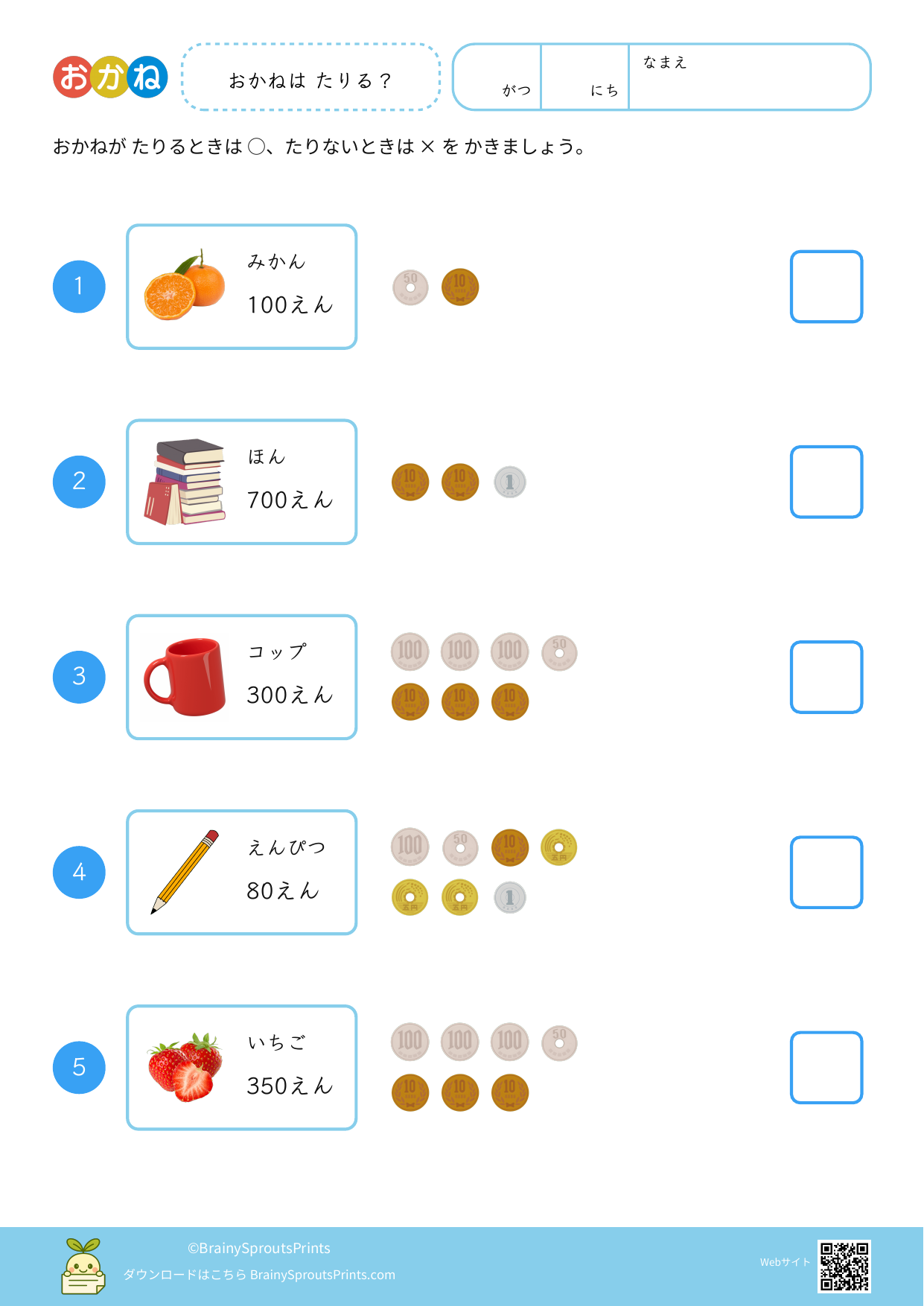 取り組んだあとは、「ほかの出し方はあるかな?」「どの硬貨ならわかりやすい?」と聞くと、金額の捉え方を整理しやすくなります。 買い物ごっこや小銭の確認と組み合わせると、数の比較や金額感覚がより具体的になります。