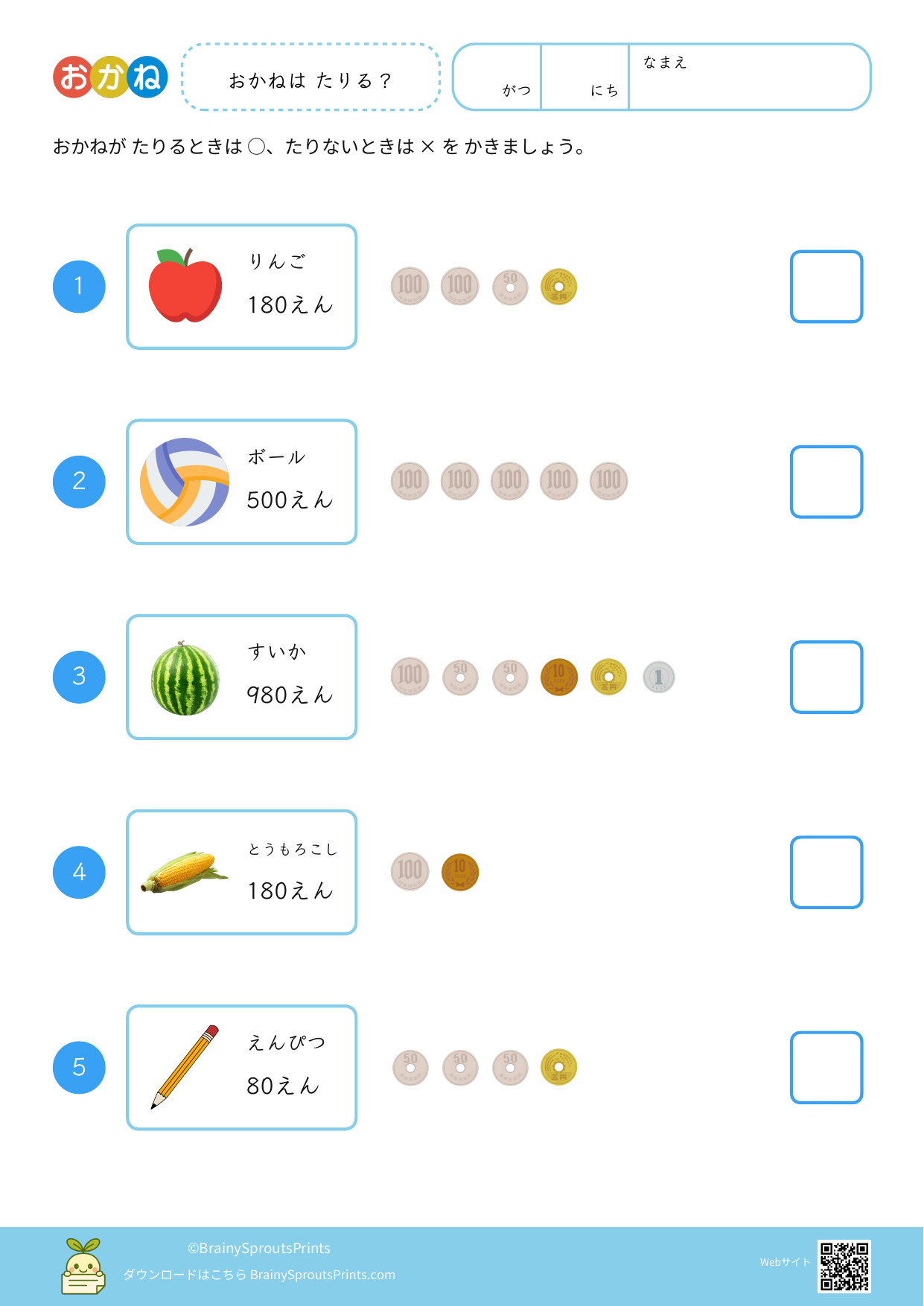 取り組んだあとは、「ほかの出し方はあるかな?」「どの硬貨ならわかりやすい?」と聞くと、金額の捉え方を整理しやすくなります。 買い物ごっこや小銭の確認と組み合わせると、数の比較や金額感覚がより具体的になります。