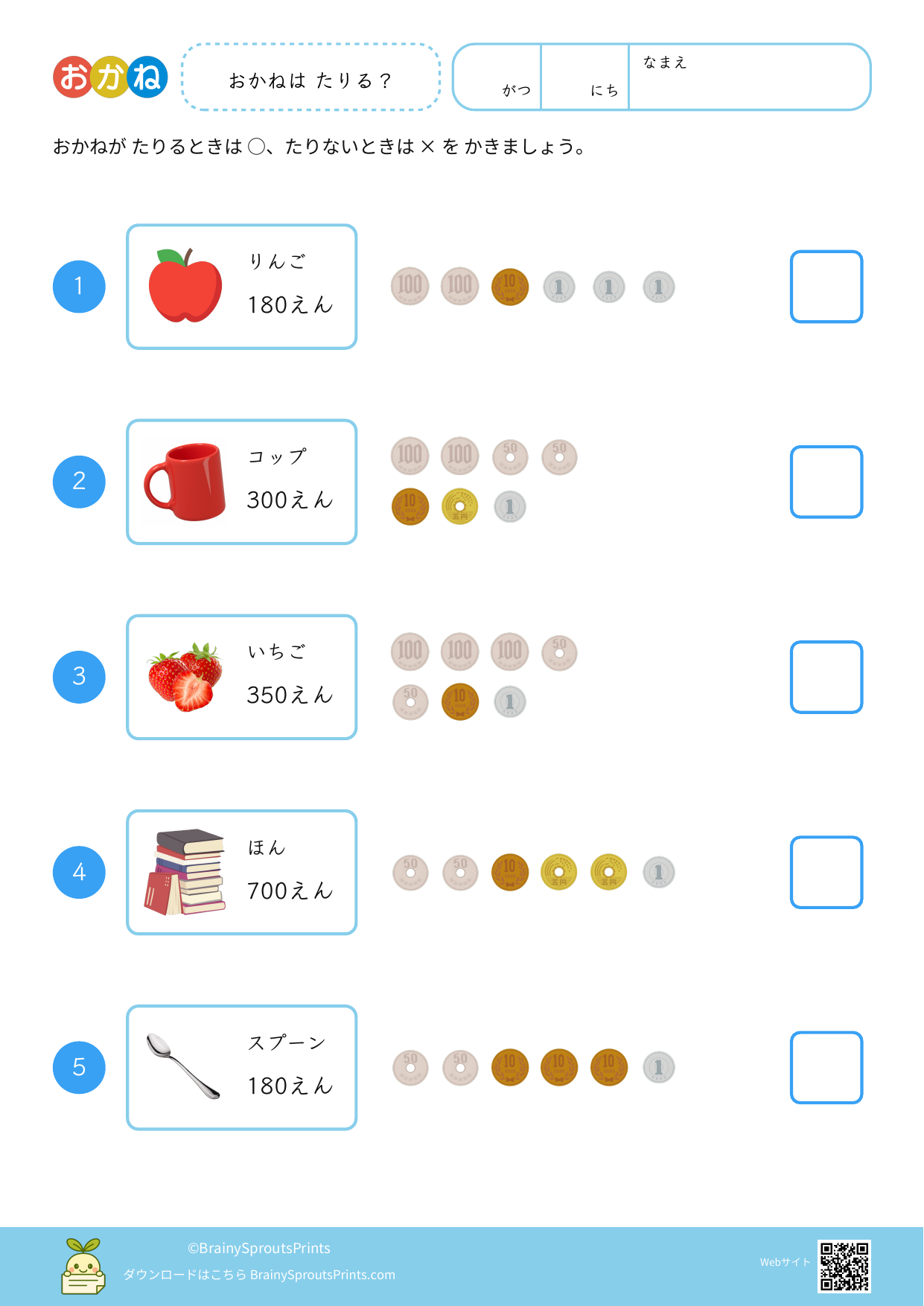 取り組んだあとは、「ほかの出し方はあるかな?」「どの硬貨ならわかりやすい?」と聞くと、金額の捉え方を整理しやすくなります。 買い物ごっこや小銭の確認と組み合わせると、数の比較や金額感覚がより具体的になります。