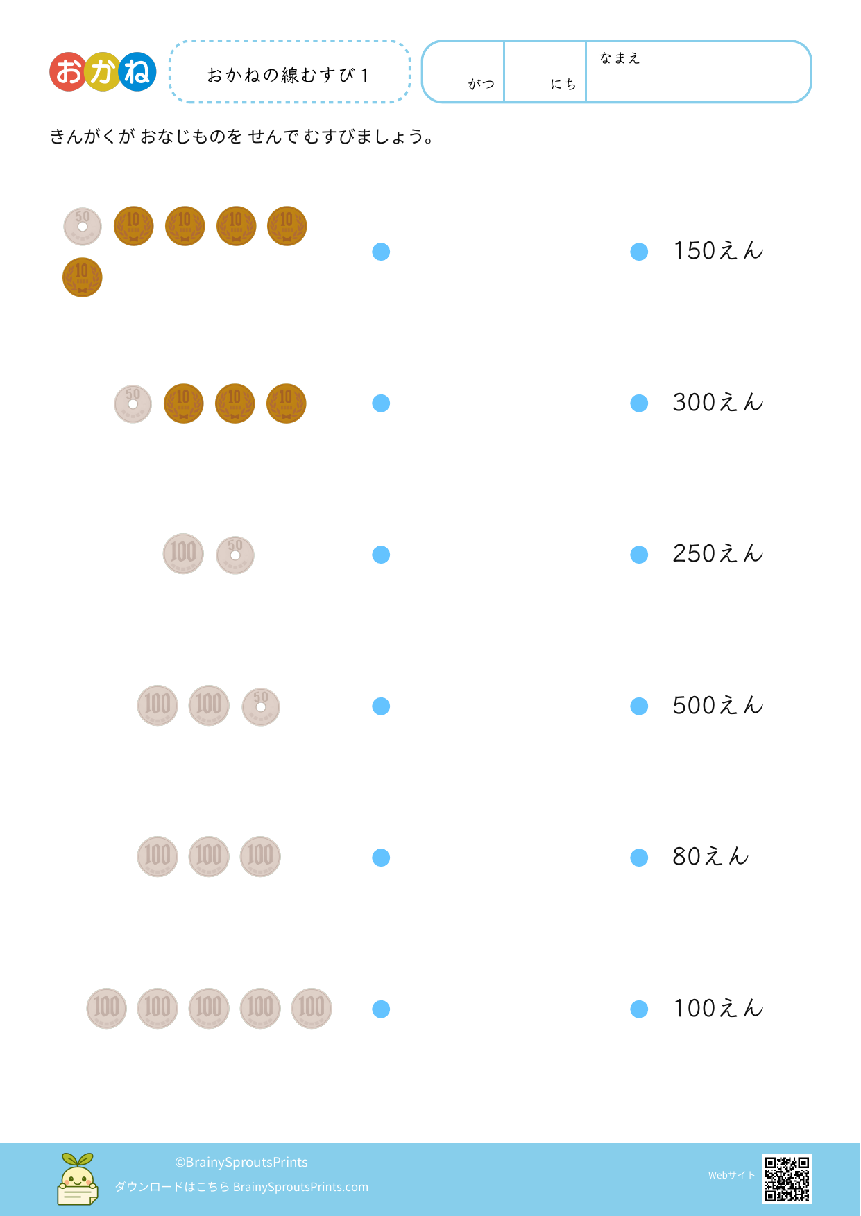 硬貨の種類や金額のまとまりを見ながら、お金の感覚を育てやすいプリントです。計算だけでなく、どの組み合わせで同じ金額になるかを考える力も見やすくなります。 生活に近い内容なので、実物と結びつけながら使うと理解が残りやすくなります。