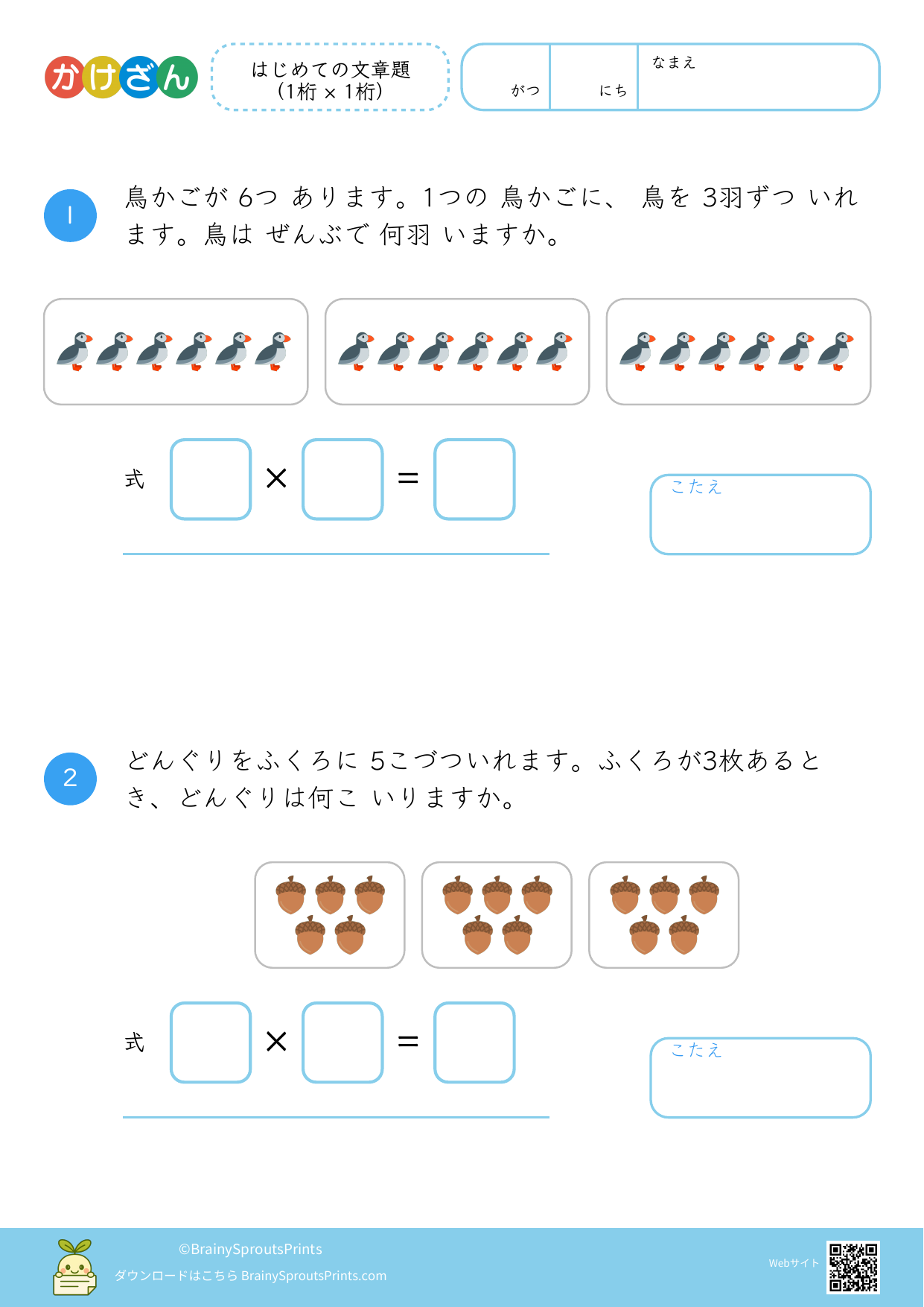同じ数のまとまりを、文章から読み取って式にしやすいプリントです。かけ算の意味を場面と一緒に理解したい時に使いやすくなっています。