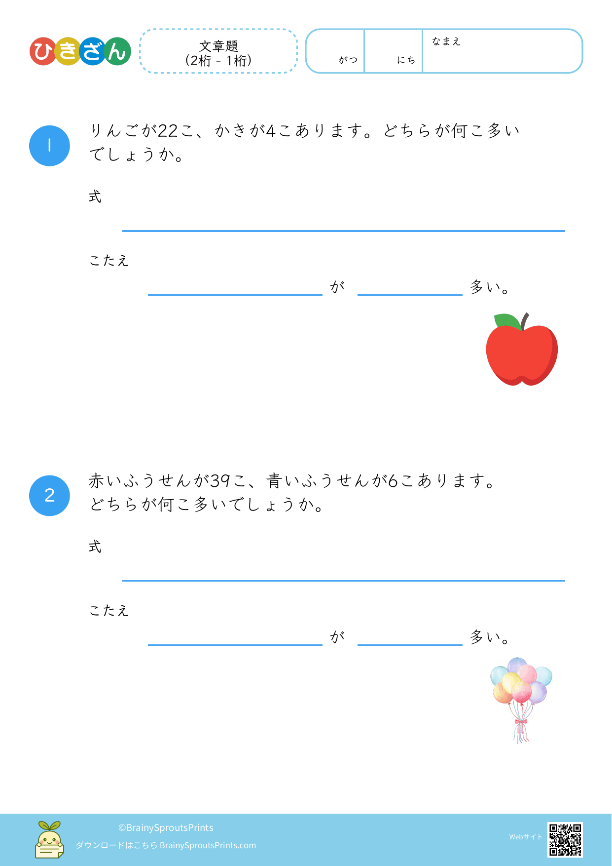 文章の中から、ひき算の場面を読み取って式に結びつけやすいプリントです。減る・残る・違いを比べる、といった場面の違いが見えてくると、文章題への苦手意識が減りやすくなります。