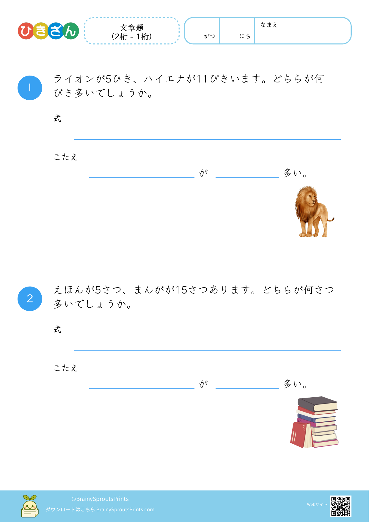 文章の中から、ひき算の場面を読み取って式に結びつけやすいプリントです。減る・残る・違いを比べる、といった場面の違いが見えてくると、文章題への苦手意識が減りやすくなります。