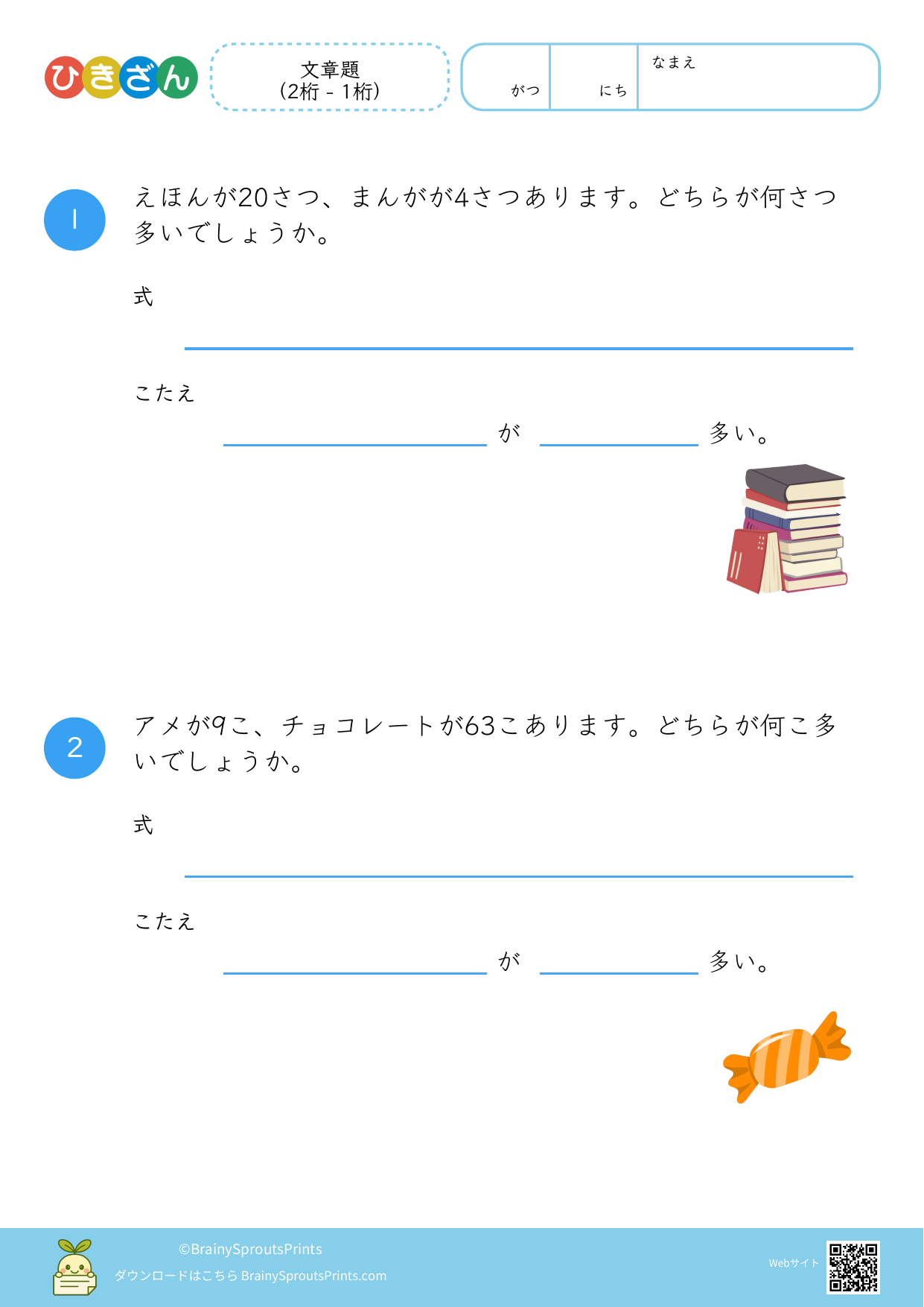 文章の中から、ひき算の場面を読み取って式に結びつけやすいプリントです。減る・残る・違いを比べる、といった場面の違いが見えてくると、文章題への苦手意識が減りやすくなります。
