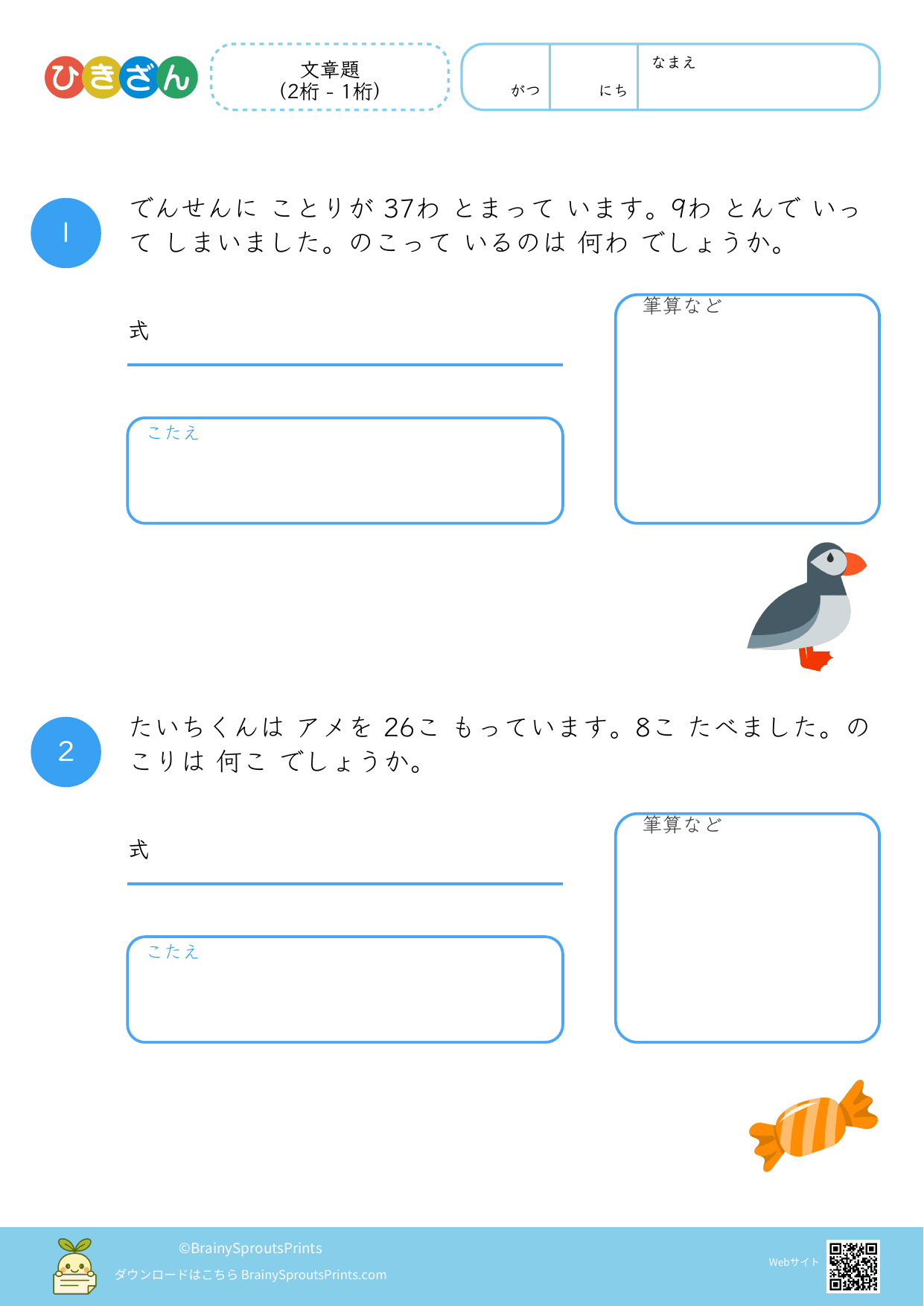 文章題(2桁 - 1桁)#2|BrainySprouts Prints