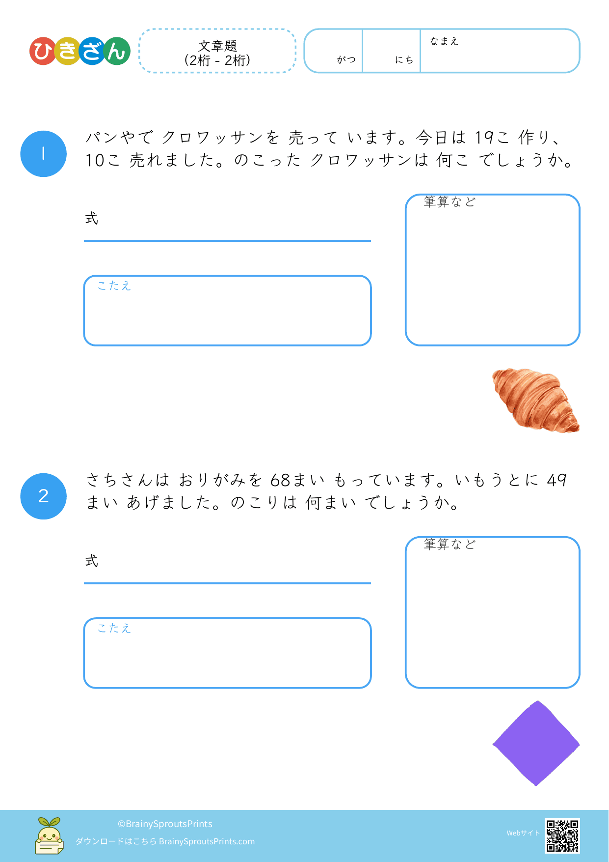 文章の中から、ひき算の場面を読み取って式に結びつけやすいプリントです。減る・残る・違いを比べる、といった場面の違いが見えてくると、文章題への苦手意識が減りやすくなります。
