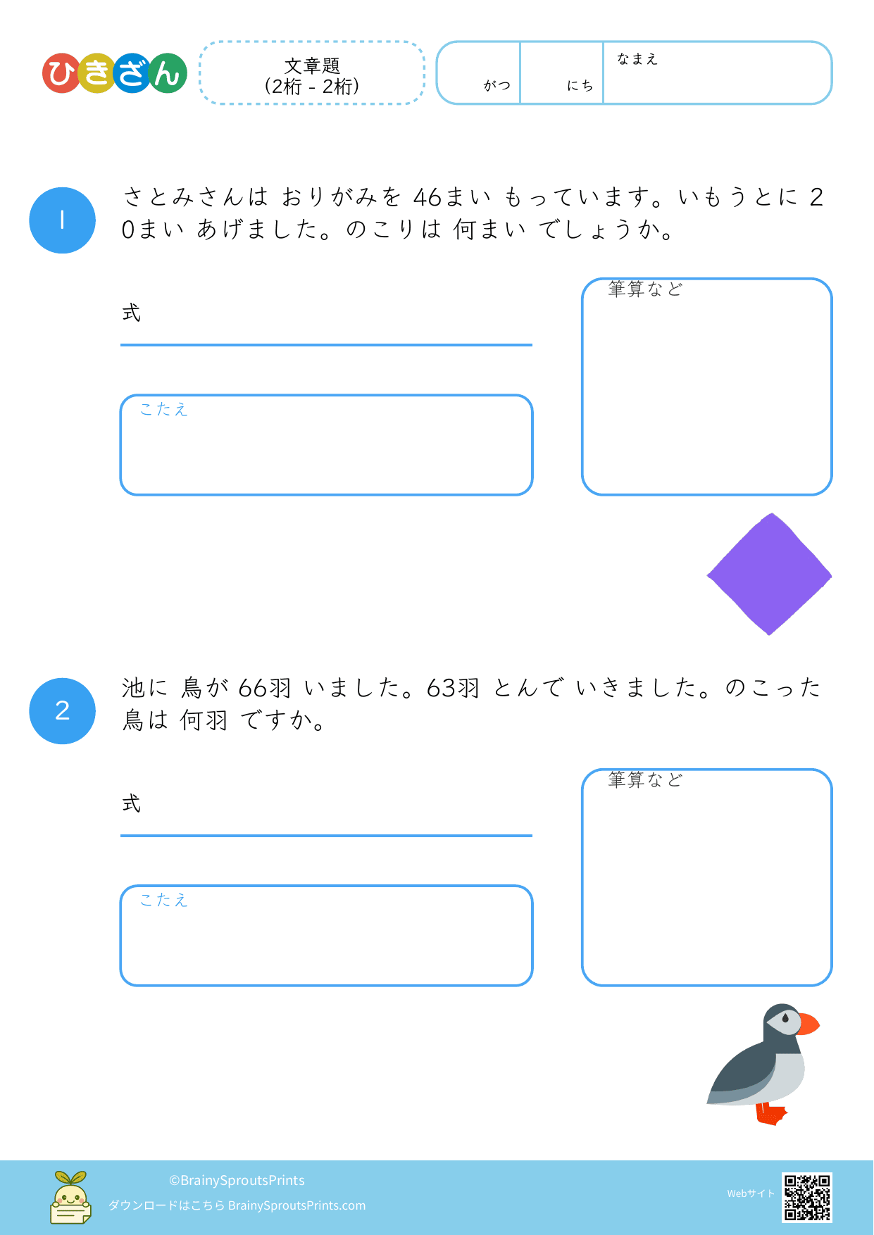 文章の中から、ひき算の場面を読み取って式に結びつけやすいプリントです。減る・残る・違いを比べる、といった場面の違いが見えてくると、文章題への苦手意識が減りやすくなります。