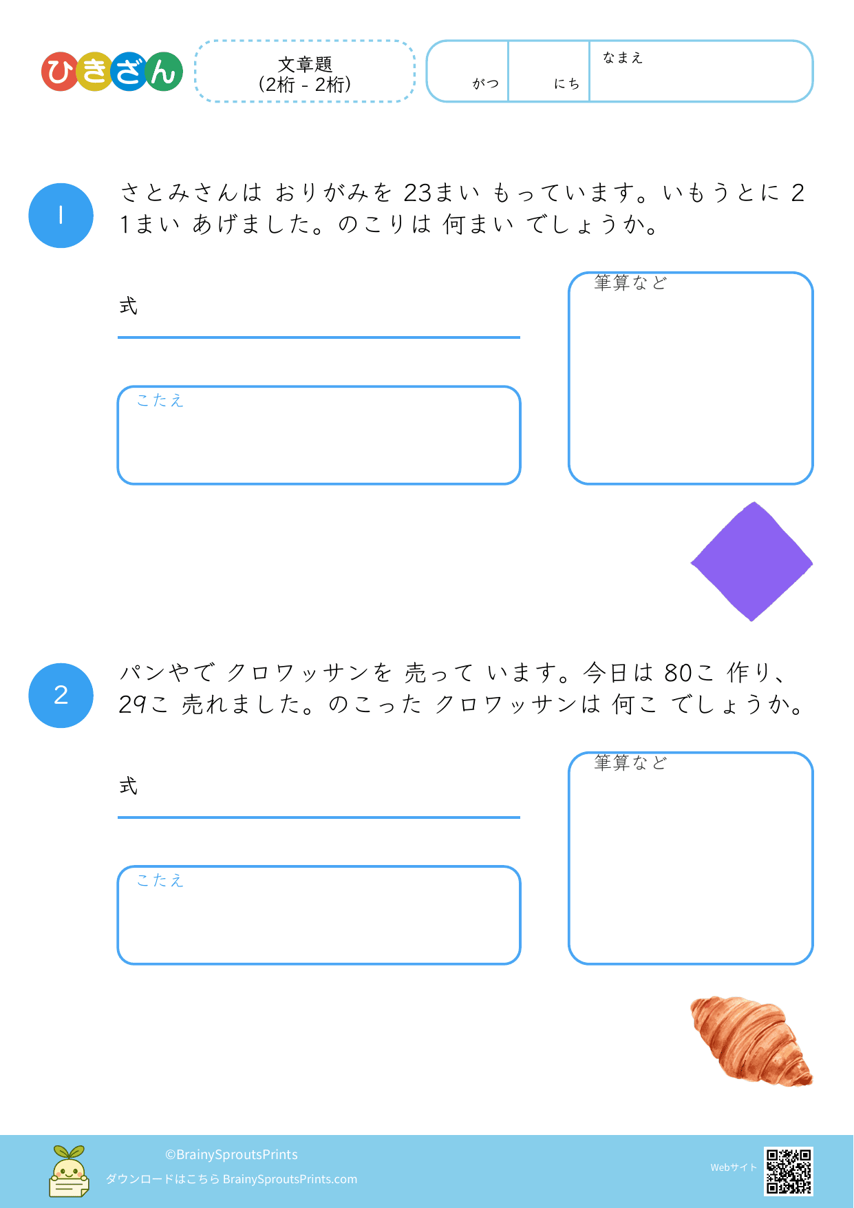 文章の中から、ひき算の場面を読み取って式に結びつけやすいプリントです。減る・残る・違いを比べる、といった場面の違いが見えてくると、文章題への苦手意識が減りやすくなります。