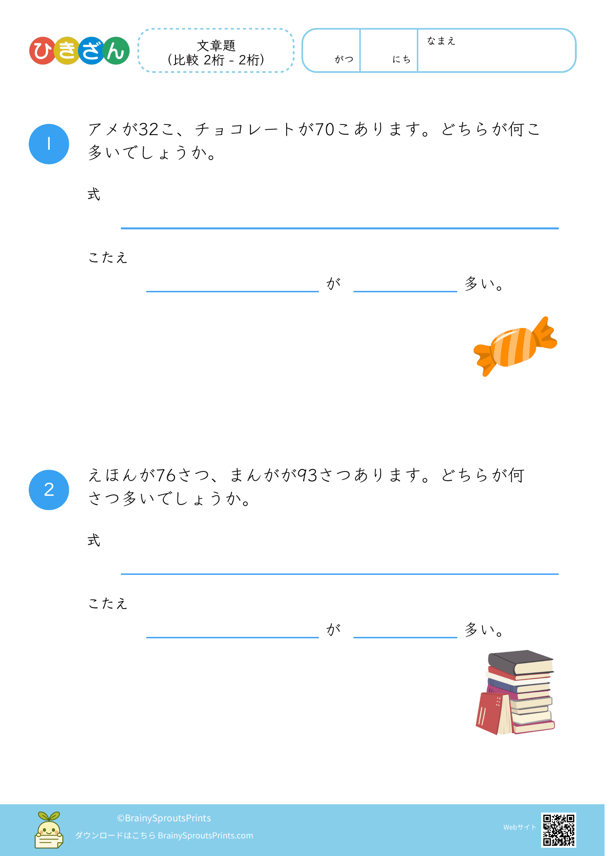 文章の中から、ひき算の場面を読み取って式に結びつけやすいプリントです。減る・残る・違いを比べる、といった場面の違いが見えてくると、文章題への苦手意識が減りやすくなります。