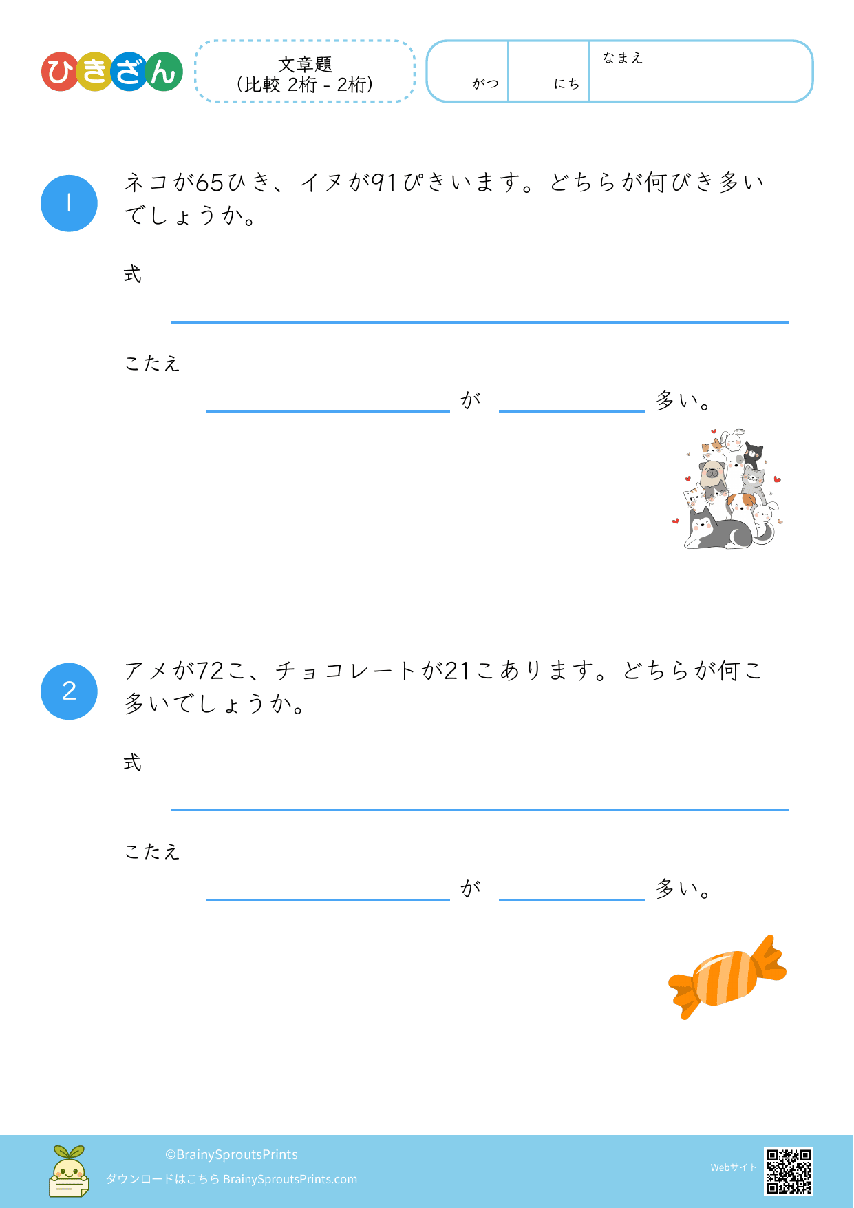 文章の中から、ひき算の場面を読み取って式に結びつけやすいプリントです。減る・残る・違いを比べる、といった場面の違いが見えてくると、文章題への苦手意識が減りやすくなります。