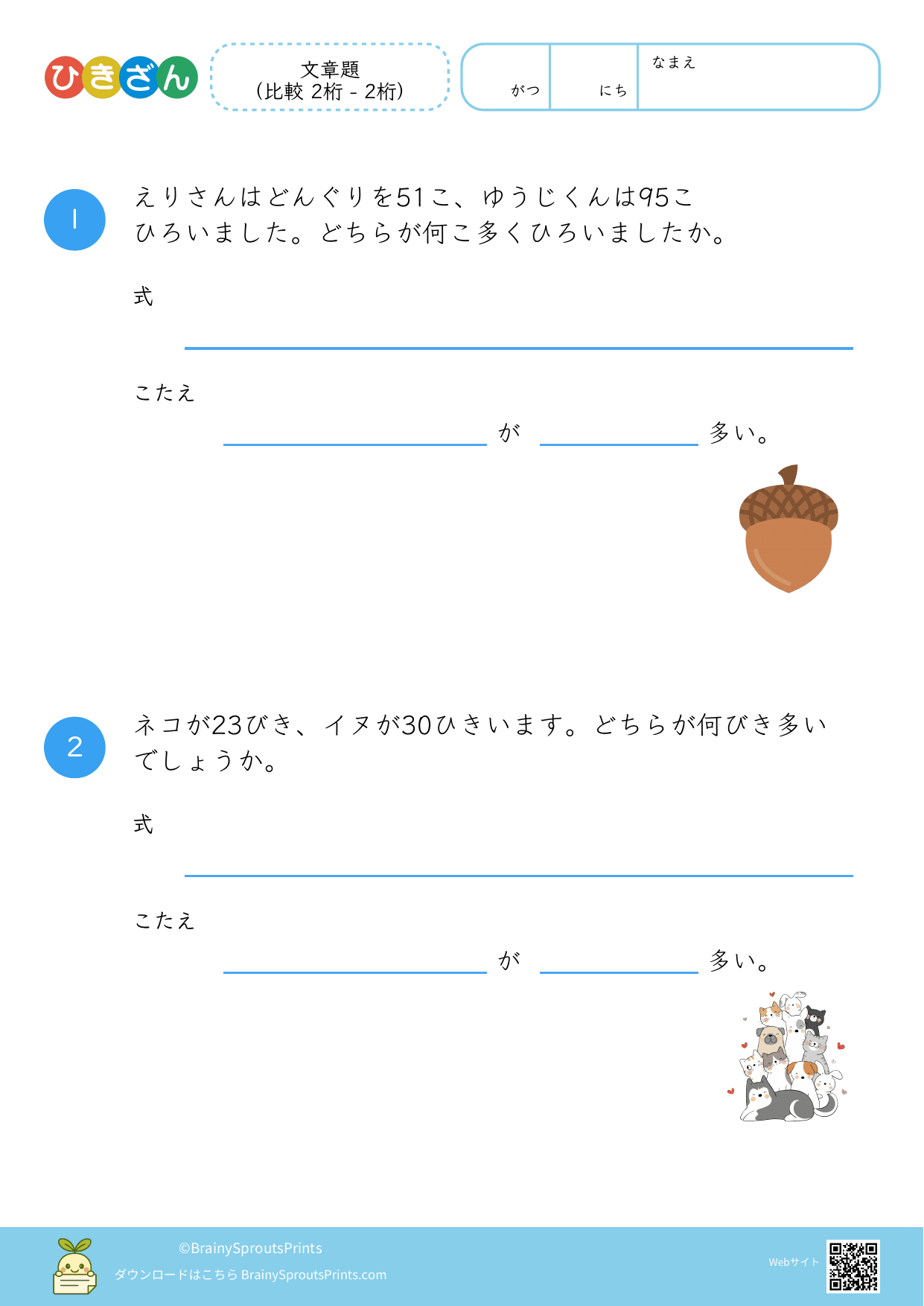 文章の中から、ひき算の場面を読み取って式に結びつけやすいプリントです。減る・残る・違いを比べる、といった場面の違いが見えてくると、文章題への苦手意識が減りやすくなります。