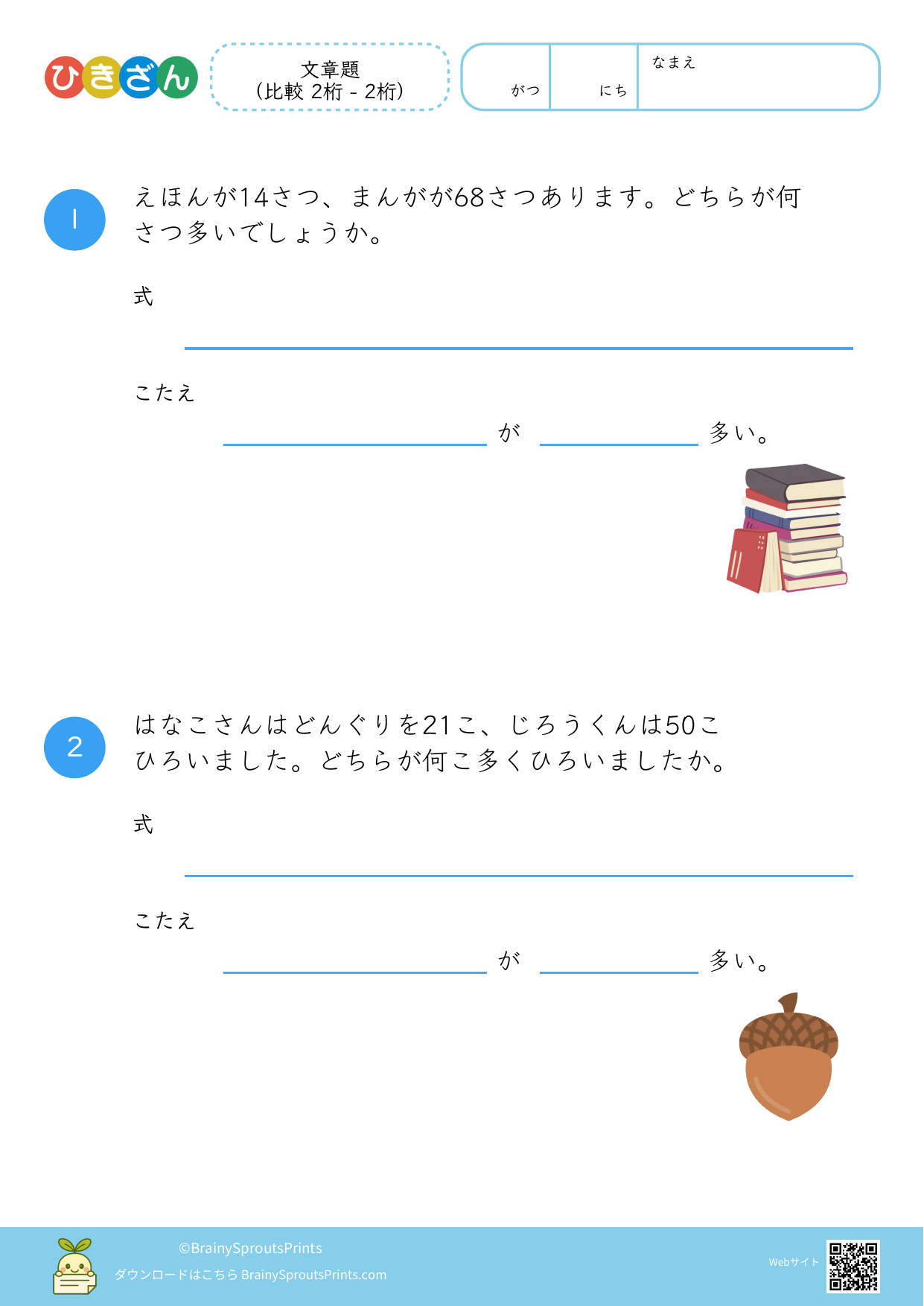 文章の中から、ひき算の場面を読み取って式に結びつけやすいプリントです。減る・残る・違いを比べる、といった場面の違いが見えてくると、文章題への苦手意識が減りやすくなります。