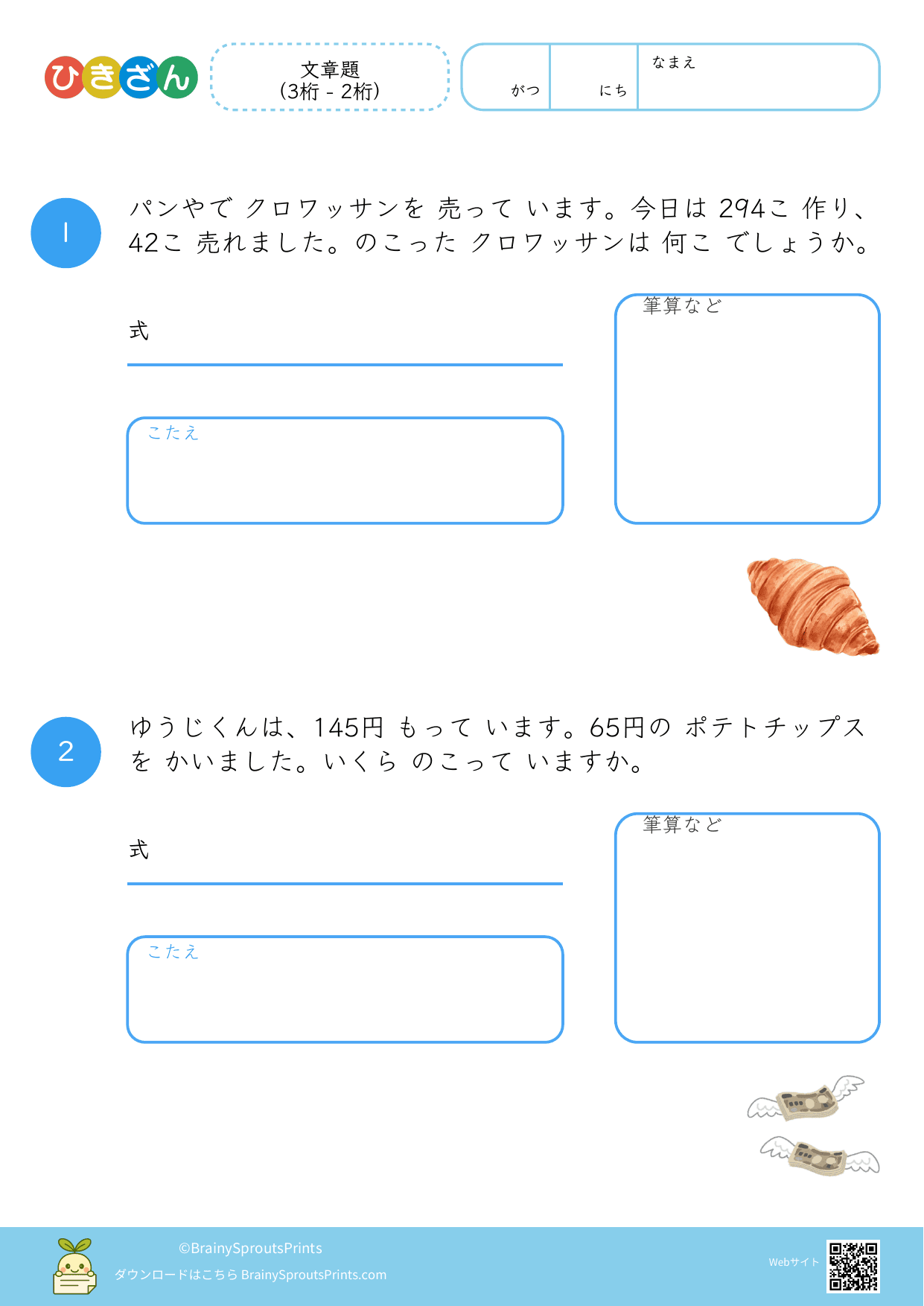 文章の中から、ひき算の場面を読み取って式に結びつけやすいプリントです。減る・残る・違いを比べる、といった場面の違いが見えてくると、文章題への苦手意識が減りやすくなります。