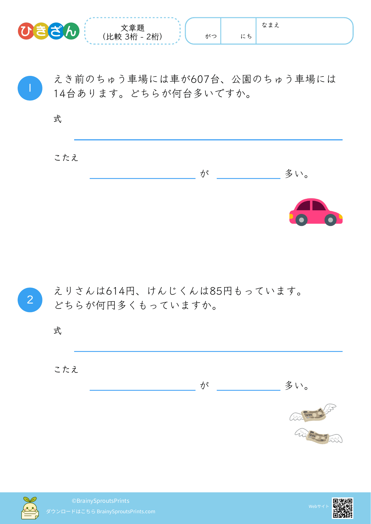 文章の中から、ひき算の場面を読み取って式に結びつけやすいプリントです。減る・残る・違いを比べる、といった場面の違いが見えてくると、文章題への苦手意識が減りやすくなります。