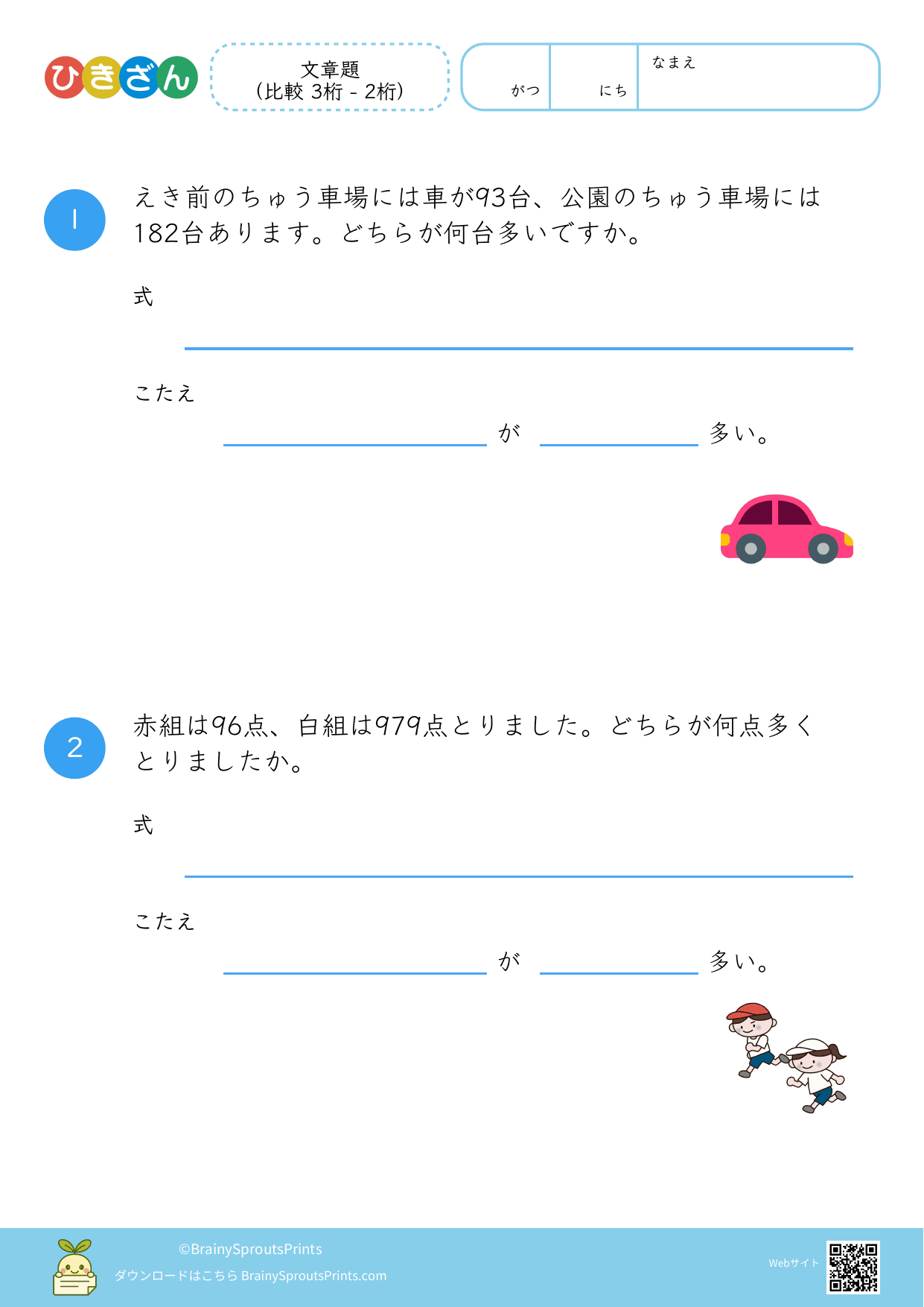 文章の中から、ひき算の場面を読み取って式に結びつけやすいプリントです。減る・残る・違いを比べる、といった場面の違いが見えてくると、文章題への苦手意識が減りやすくなります。
