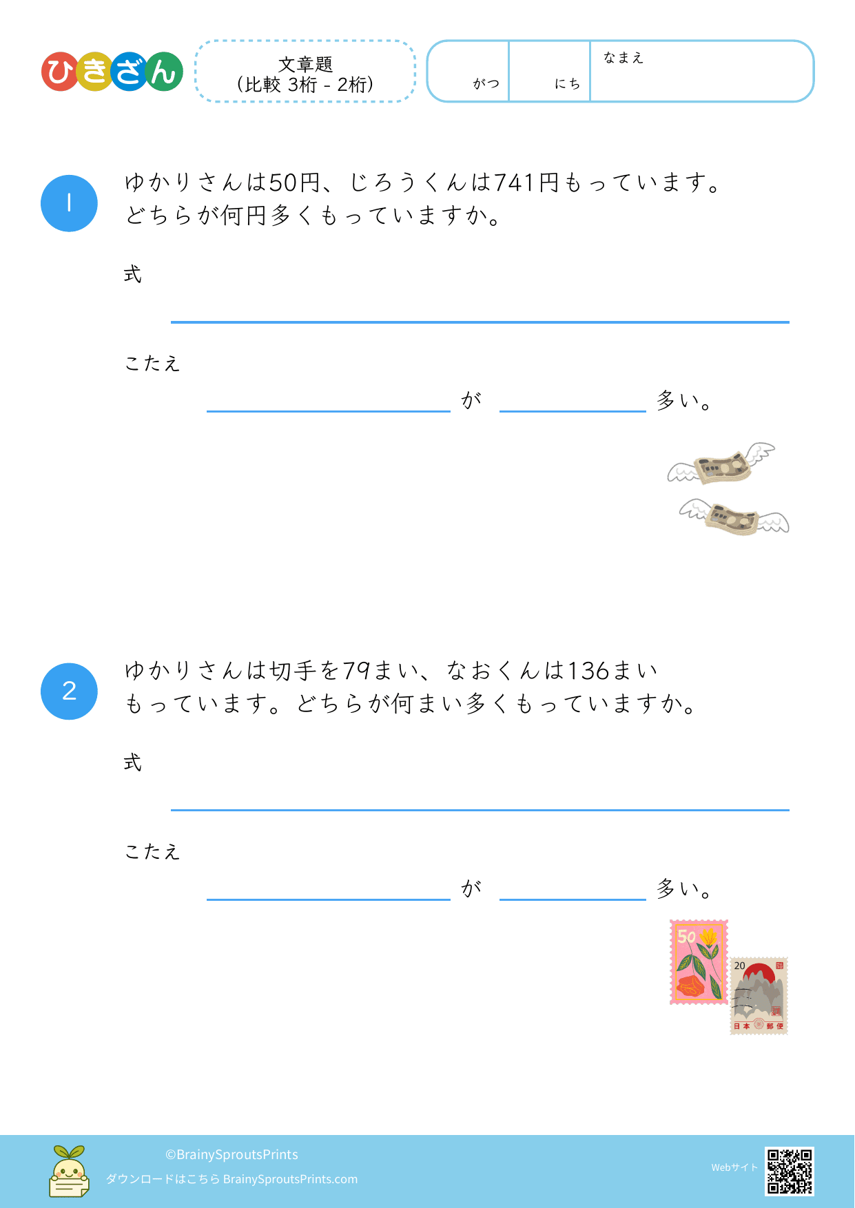文章の中から、ひき算の場面を読み取って式に結びつけやすいプリントです。減る・残る・違いを比べる、といった場面の違いが見えてくると、文章題への苦手意識が減りやすくなります。