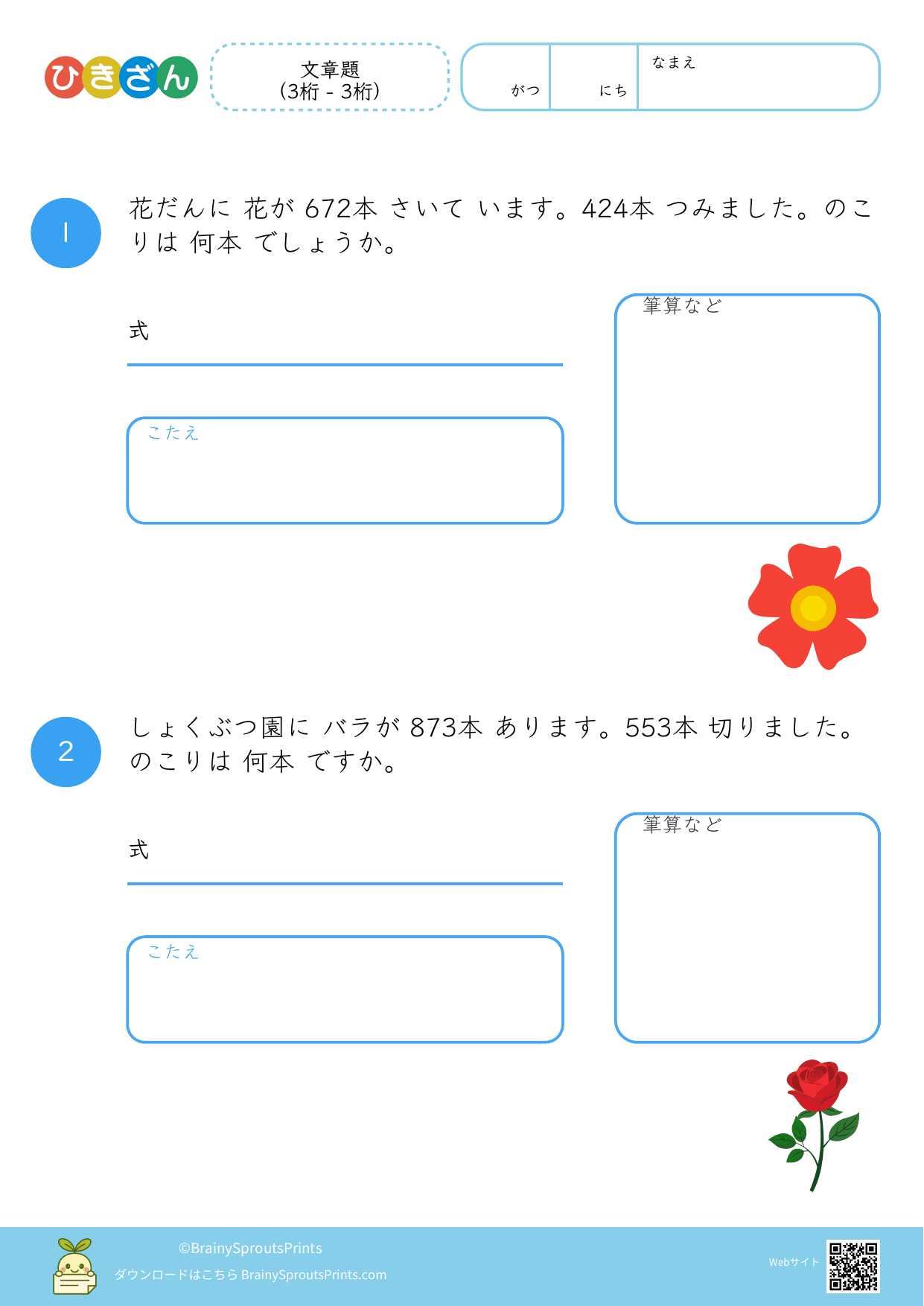 文章の中から、ひき算の場面を読み取って式に結びつけやすいプリントです。減る・残る・違いを比べる、といった場面の違いが見えてくると、文章題への苦手意識が減りやすくなります。