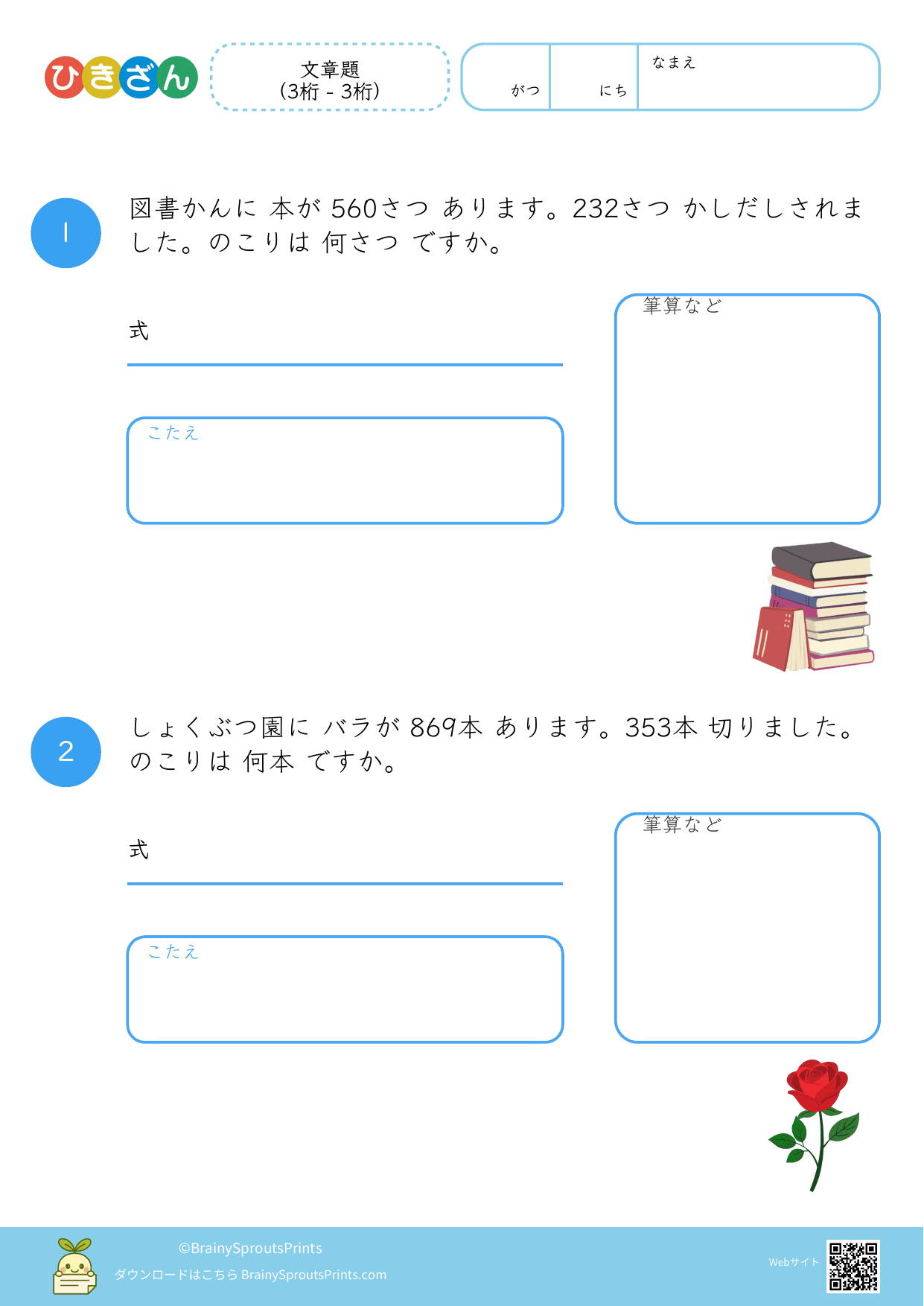文章の中から、ひき算の場面を読み取って式に結びつけやすいプリントです。減る・残る・違いを比べる、といった場面の違いが見えてくると、文章題への苦手意識が減りやすくなります。