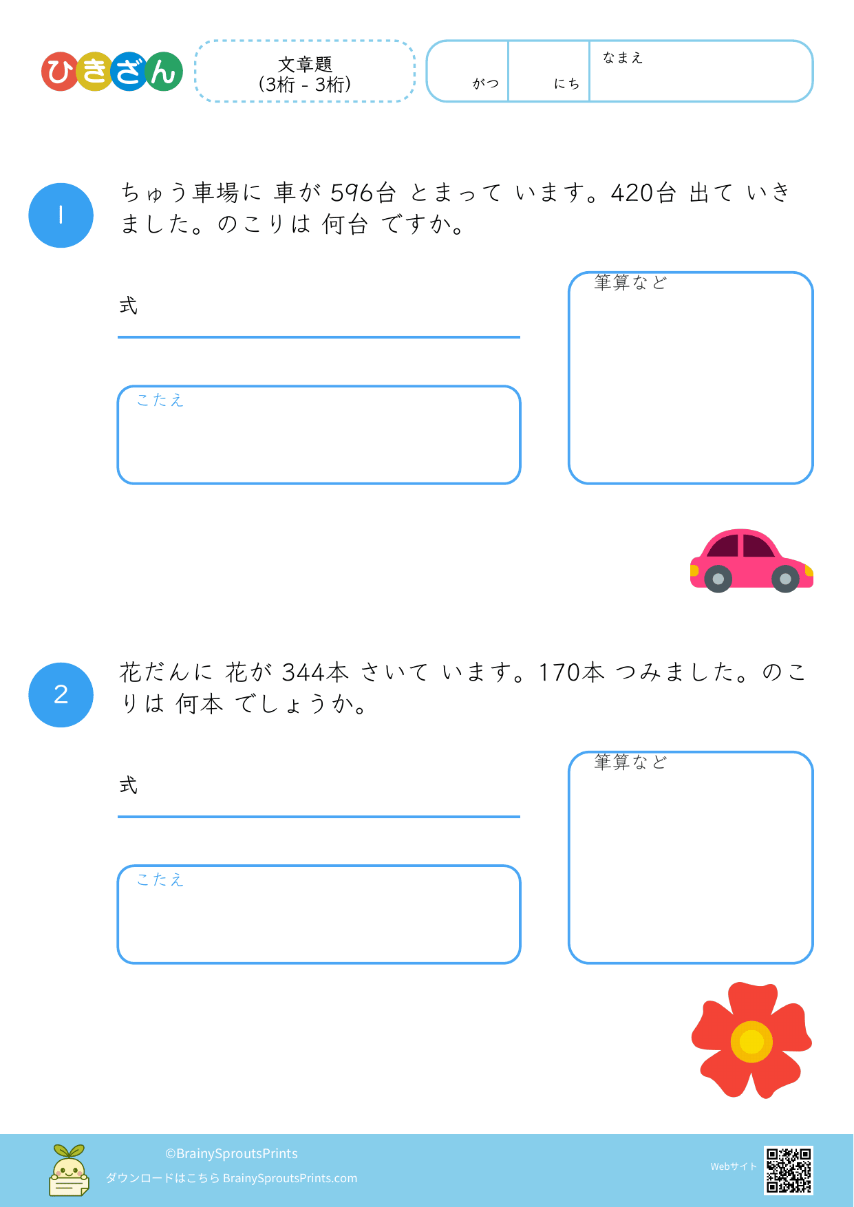 文章の中から、ひき算の場面を読み取って式に結びつけやすいプリントです。減る・残る・違いを比べる、といった場面の違いが見えてくると、文章題への苦手意識が減りやすくなります。