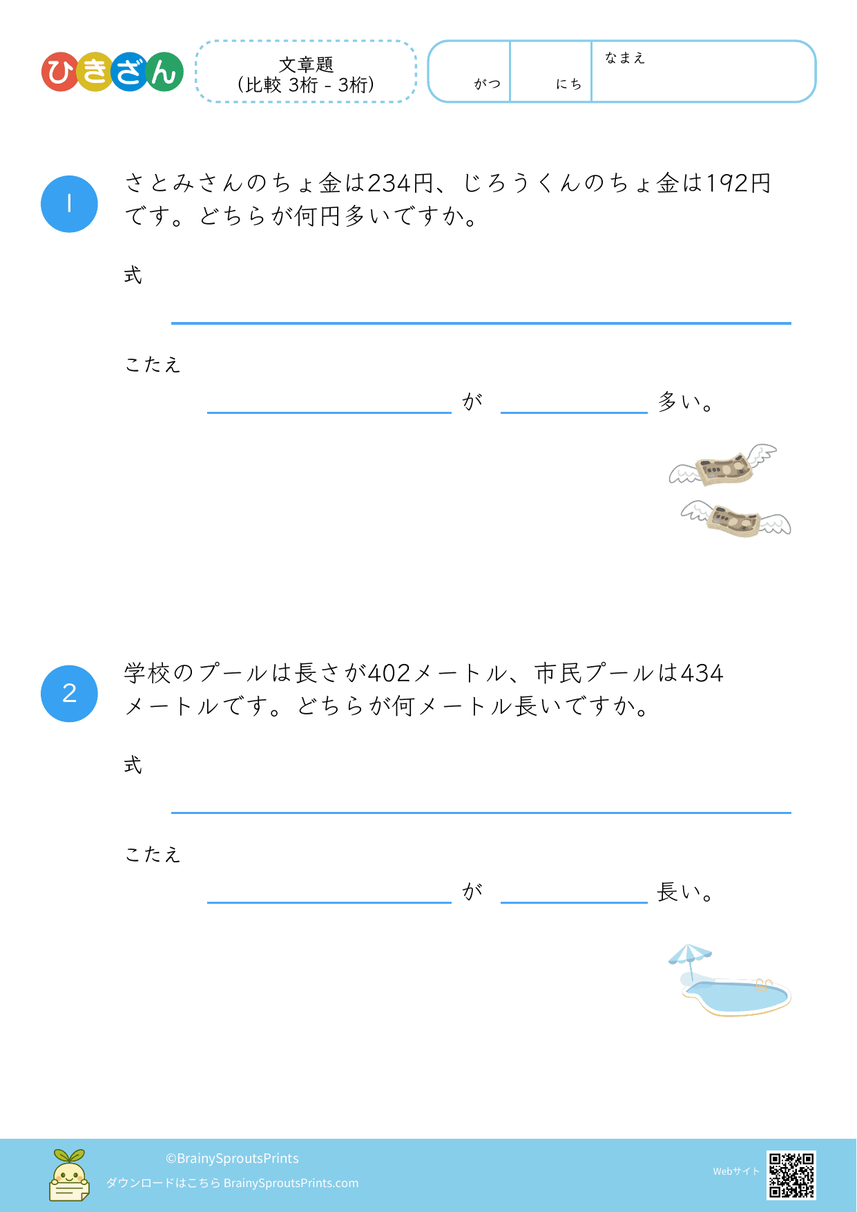 文章の中から、ひき算の場面を読み取って式に結びつけやすいプリントです。減る・残る・違いを比べる、といった場面の違いが見えてくると、文章題への苦手意識が減りやすくなります。