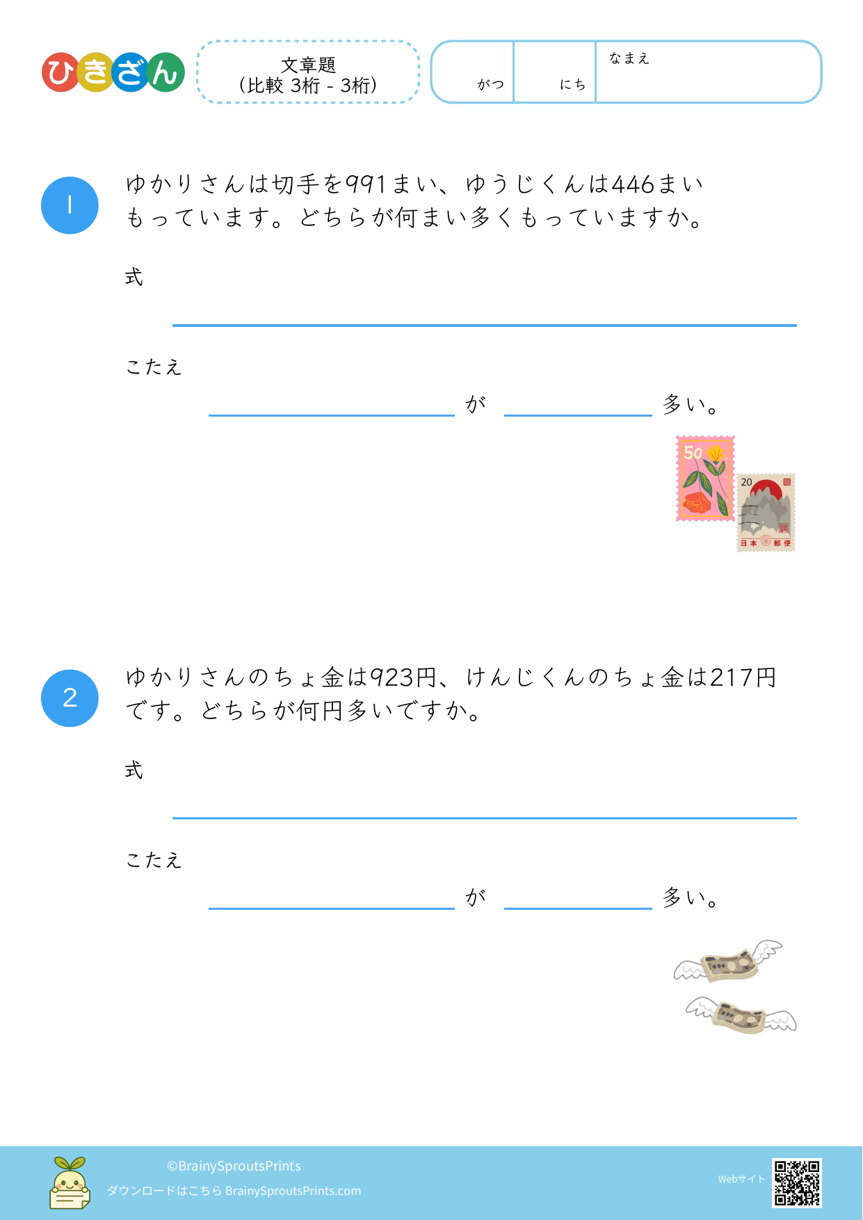 文章の中から、ひき算の場面を読み取って式に結びつけやすいプリントです。減る・残る・違いを比べる、といった場面の違いが見えてくると、文章題への苦手意識が減りやすくなります。