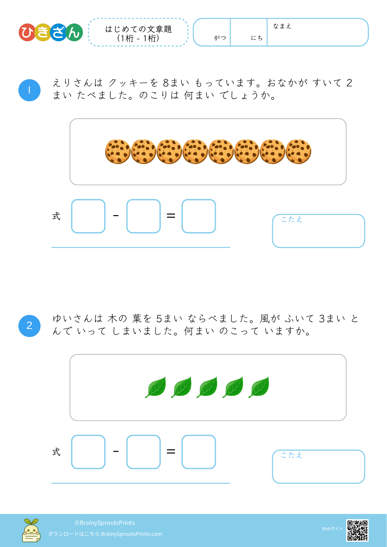 文章の中から、ひき算の場面を読み取って式に結びつけやすいプリントです。減る・残る・違いを比べる、といった場面の違いが見えてくると、文章題への苦手意識が減りやすくなります。