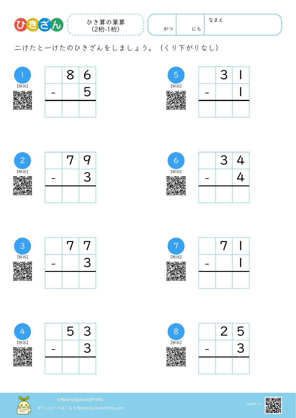 ひき算の筆算 (2桁-1桁)#1