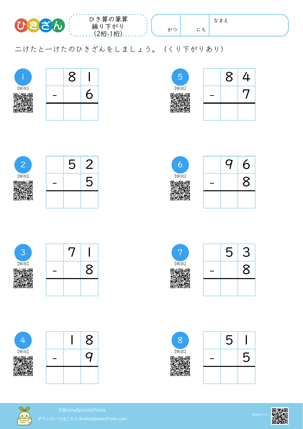ひき算の筆算 繰り下がり(2桁-1桁)#2