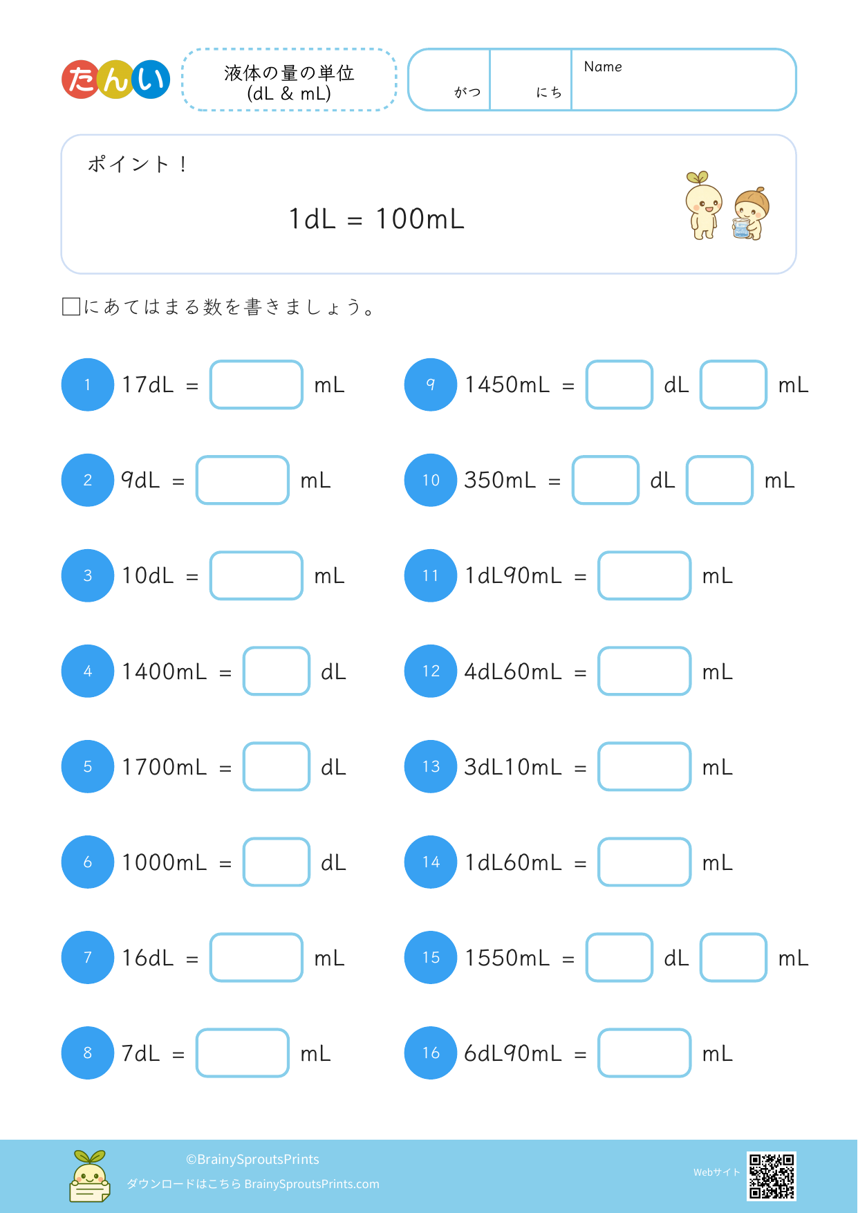 長さ、重さ、かさなどの単位の関係を整理しやすいプリントです。数字の計算だけでなく、どの単位で考えるとわかりやすいかを見ながら進めると、生活の中でも使いやすくなります。
