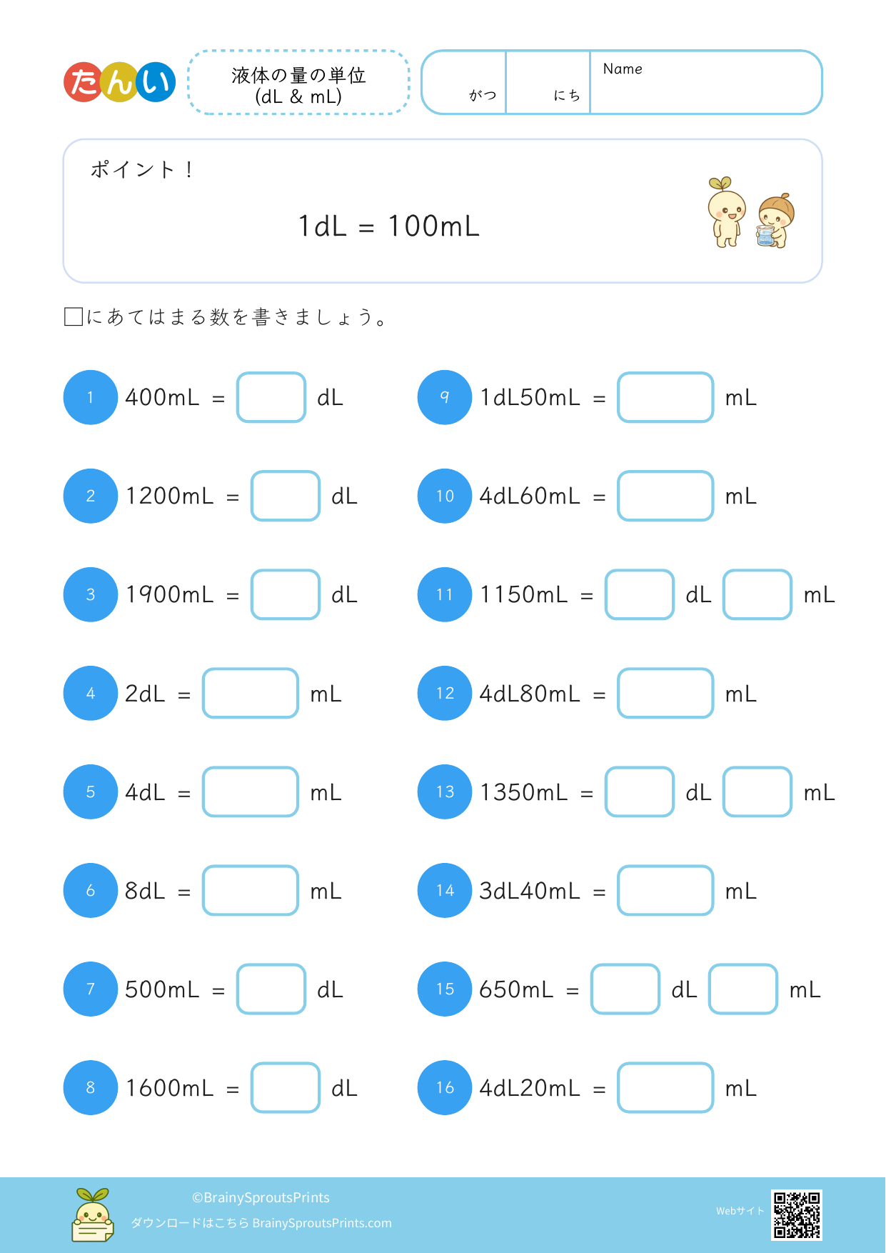 長さ、重さ、かさなどの単位の関係を整理しやすいプリントです。数字の計算だけでなく、どの単位で考えるとわかりやすいかを見ながら進めると、生活の中でも使いやすくなります。