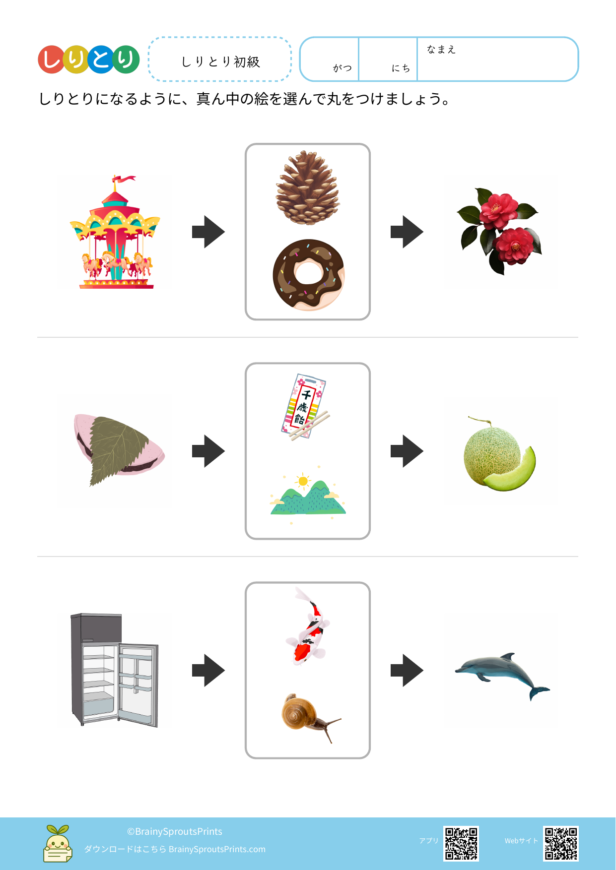 ことばのつながりを考えながら、語彙を広げやすいプリントです。正解を出すだけでなく、どんな言葉を思いついたかをたどることで、今ある語彙の量や偏りも見えやすくなります。 しりとりは遊びに見えますが、音への意識や語彙の引き出しを使う練習として相性のよい活動です。